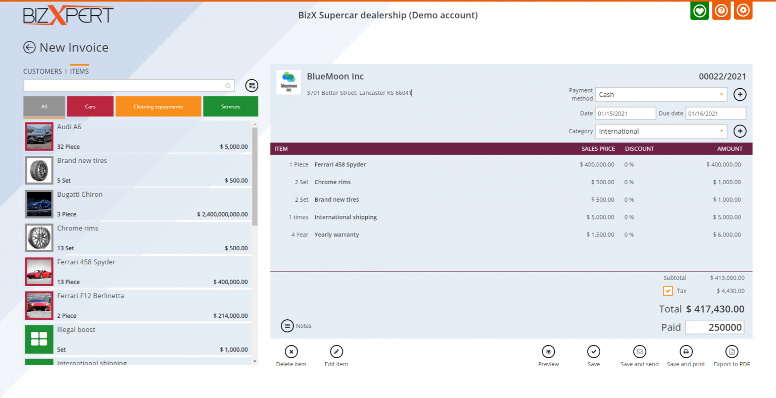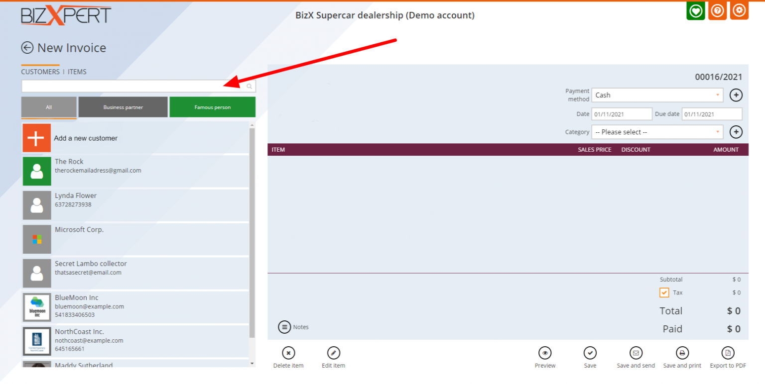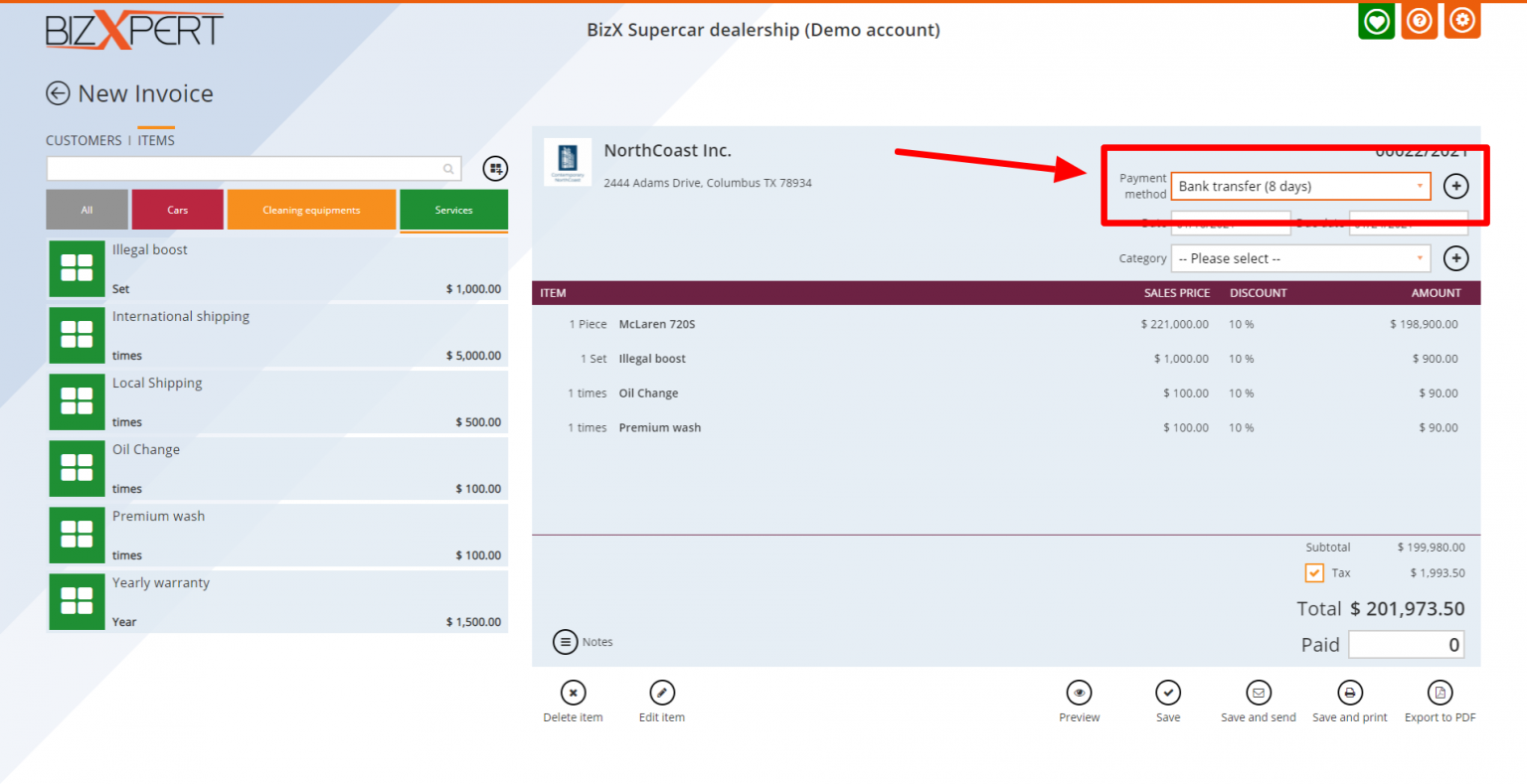 Just click on the customer card, and all of the customer data will be added to the invoice. The Payment method will be automatically set to the right customer, so you don't have to select that every time. The Due date will be automatically set according to the Payment method. Discount automatically calculated if you set it to your customer before. After you select a customer, the items will appear instantly, so you can create invoices quicker than ever.