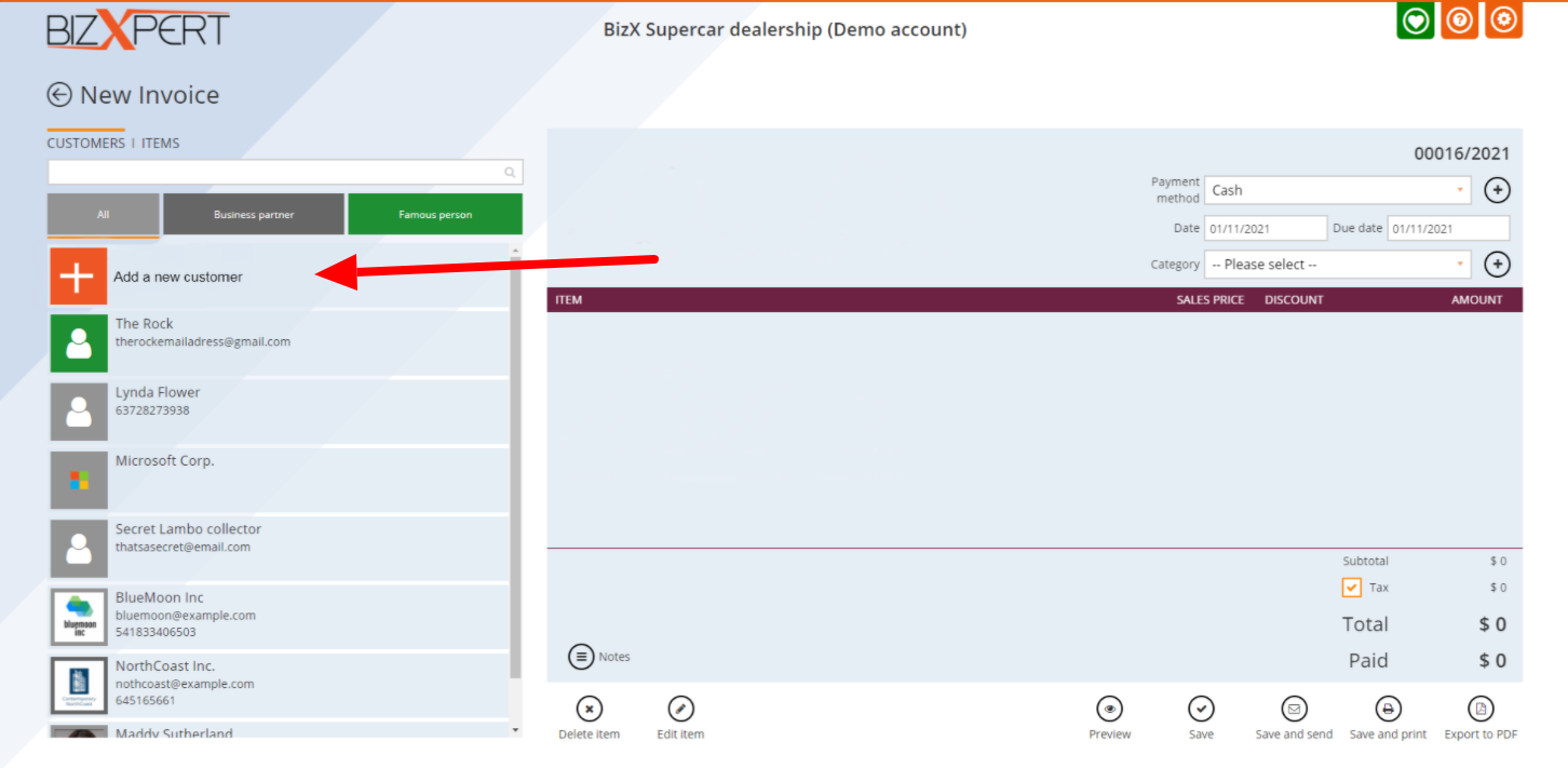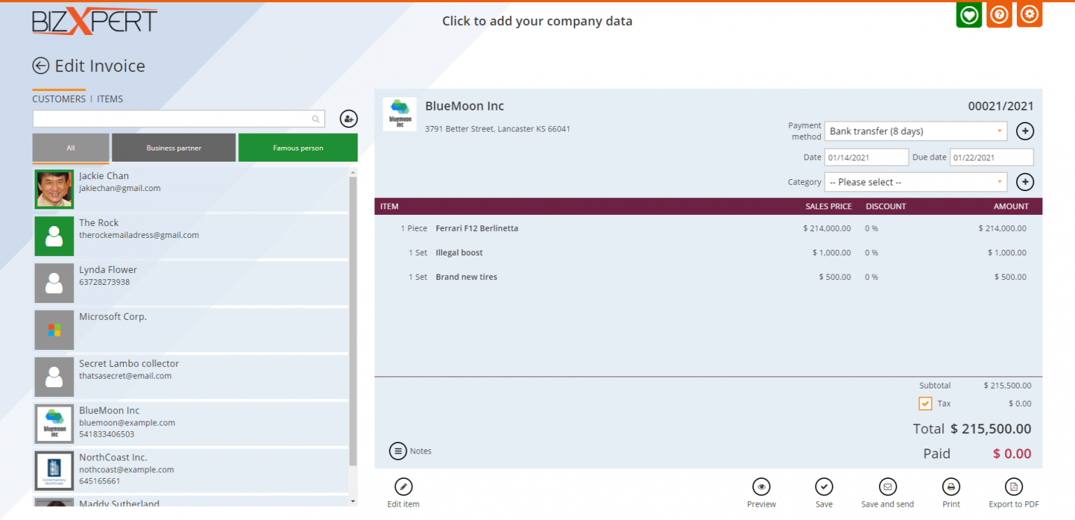 Just click on the "Add a new customer" or the "Add a new item" card, and the customer/item creation popup will be appear. Hit Save when you ready, and your customer or item will be added to the invoice, and saved for your database. You can create an unlimited amount of customers and item for FREE