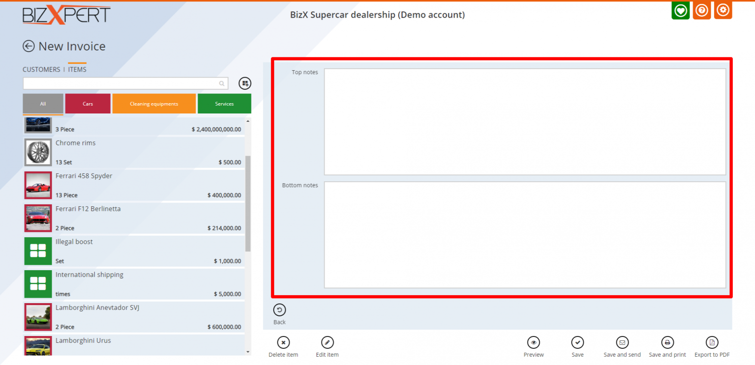 Add top and bottom notes to you invoice. You can add notes temporary and/or permanently. Set your Terms and Conditions to your bottom notes, and that will be automatically appear on every invoice