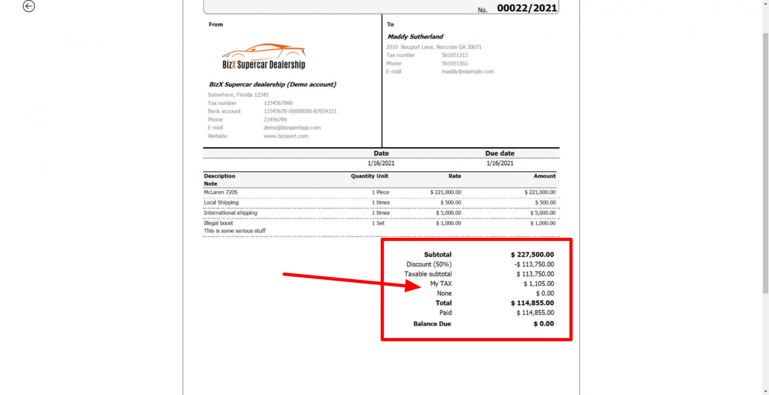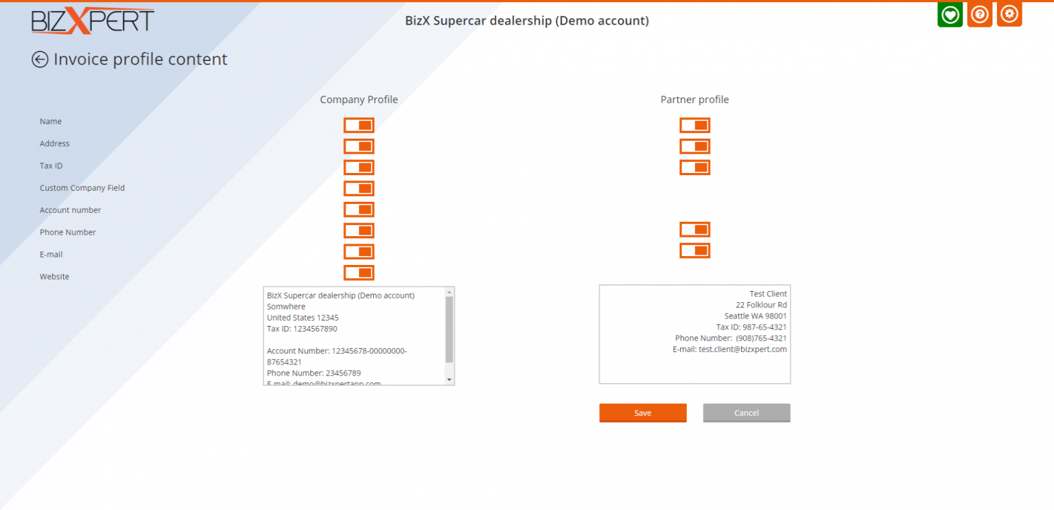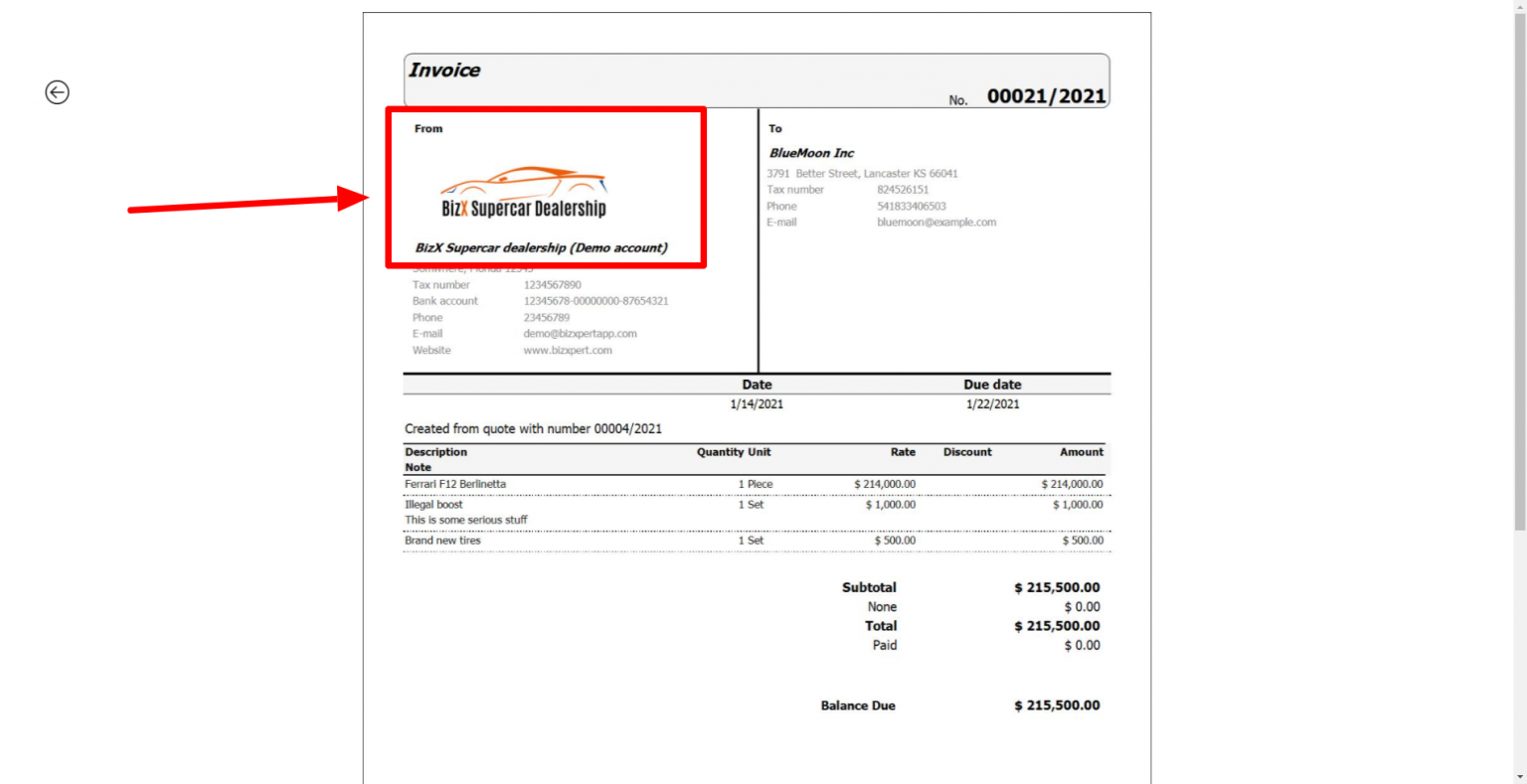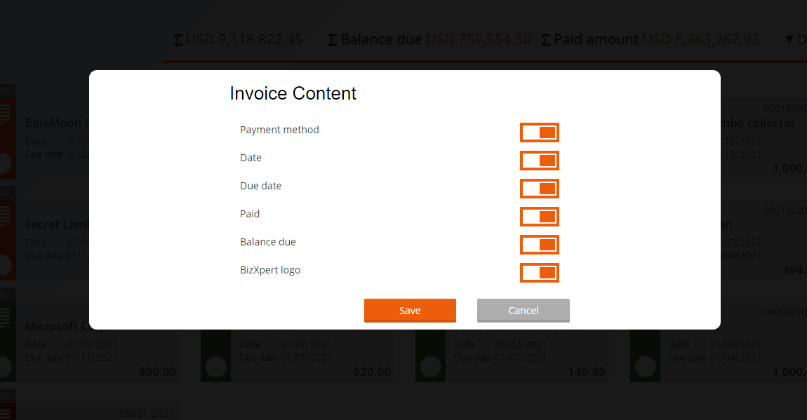 You can decide what ti show on an invoice, and what not Show or hide the Payment method, Creation date, Due date, Piad amount, Balance due You can hide the BizXpert logo from the invoices for FREE if you want