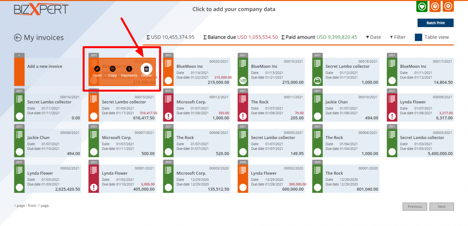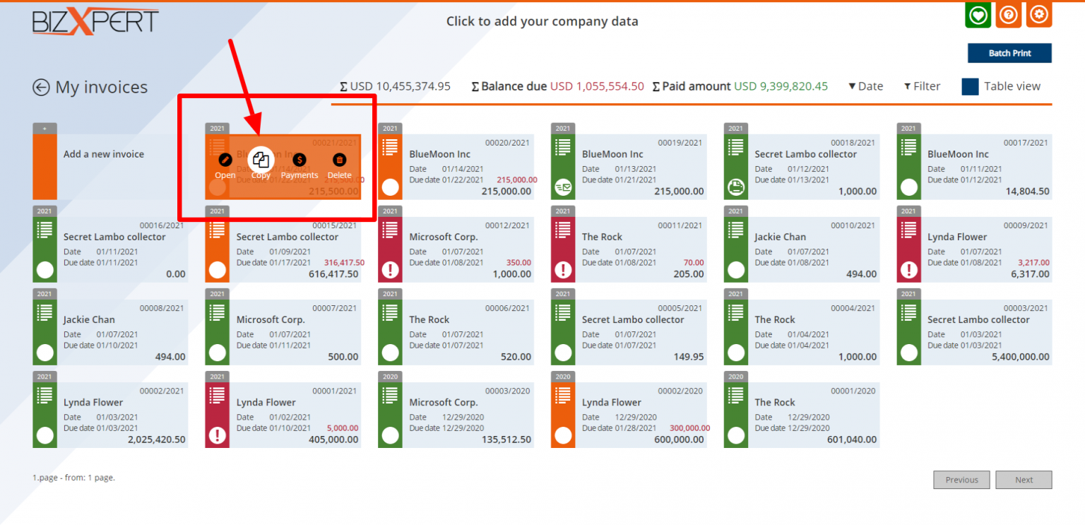 Set the invoice creation date to any date. The Due date will be automatically set by the Payment method, but you are able set it manually. If the invoice will not be paid before the Due date, the color of the invoice card will be red, and you can see the unpaid invoices in a separate list to quickly find who owns you