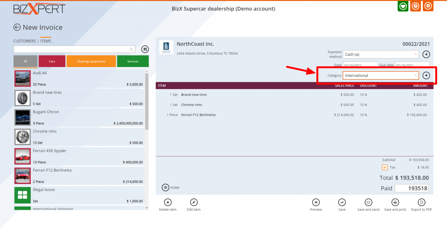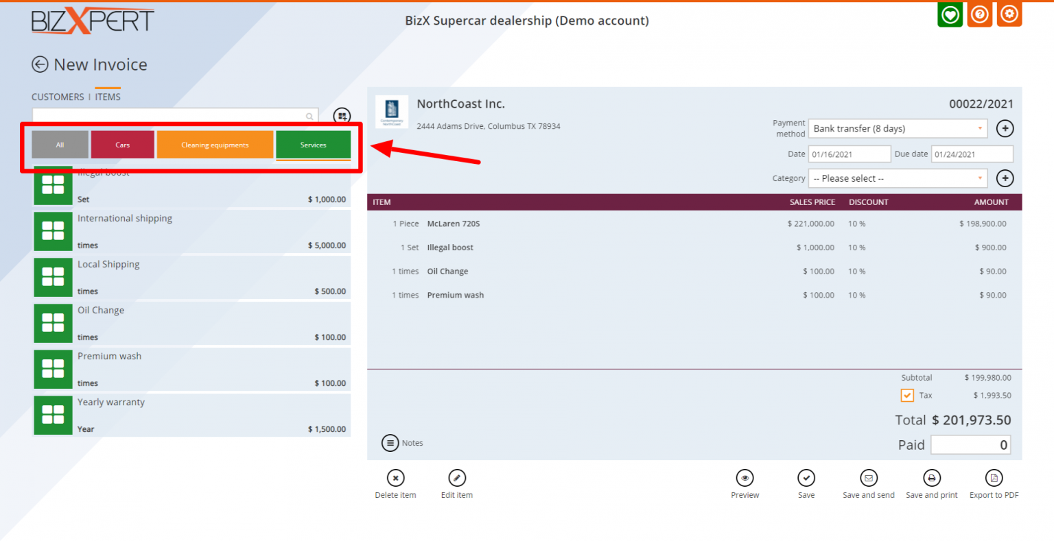 Be more organized, and create up to an unlimited amount of customer and item categories. Just select the right category, and your customers and item will be filtered when you create an invoice, so you can find everything quicker. Create up to an unlimited amount of categies for FREE