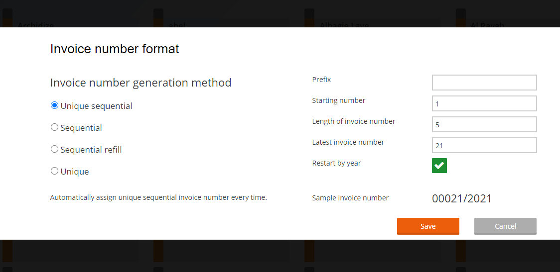 4 types of Invoice number format for the maxiumom personalization. Unique sequential - Automatically assign unique sequential invoice number every time. Sequential - Assign sequential invoice number. When last issued invoice is cancelled the number will be reassigned. Sequential refill - Assign sequential invoice number. When any invoice cancelled that number will be reassigned. Unique - Make every invoice number unique.