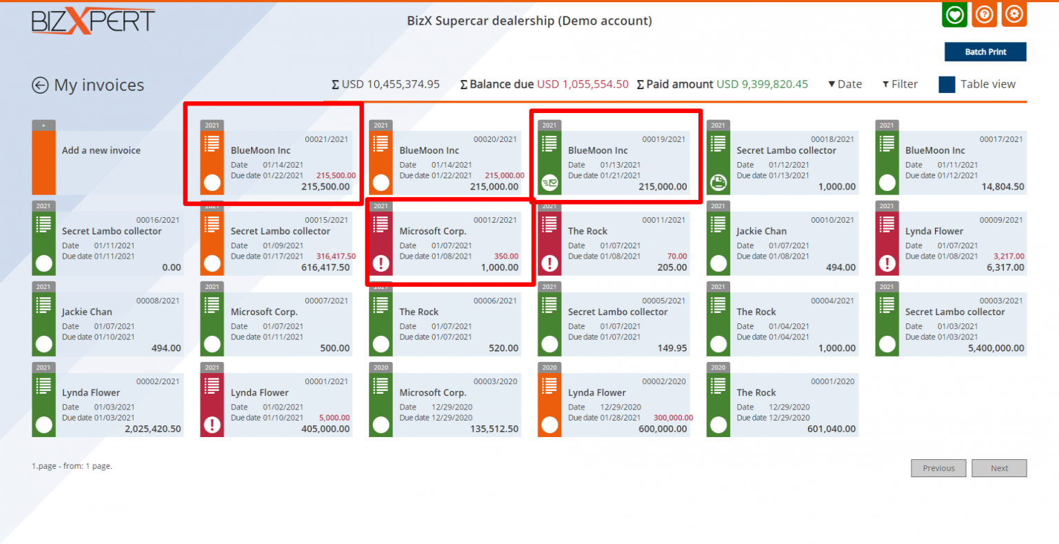 Colour coded paid statuses for the better view for your current invoice status. Green is for the paid invoices. Orange is for the unpaid invoices. Red is for the invoices for which the payment deadline has expired and has not yet been paid