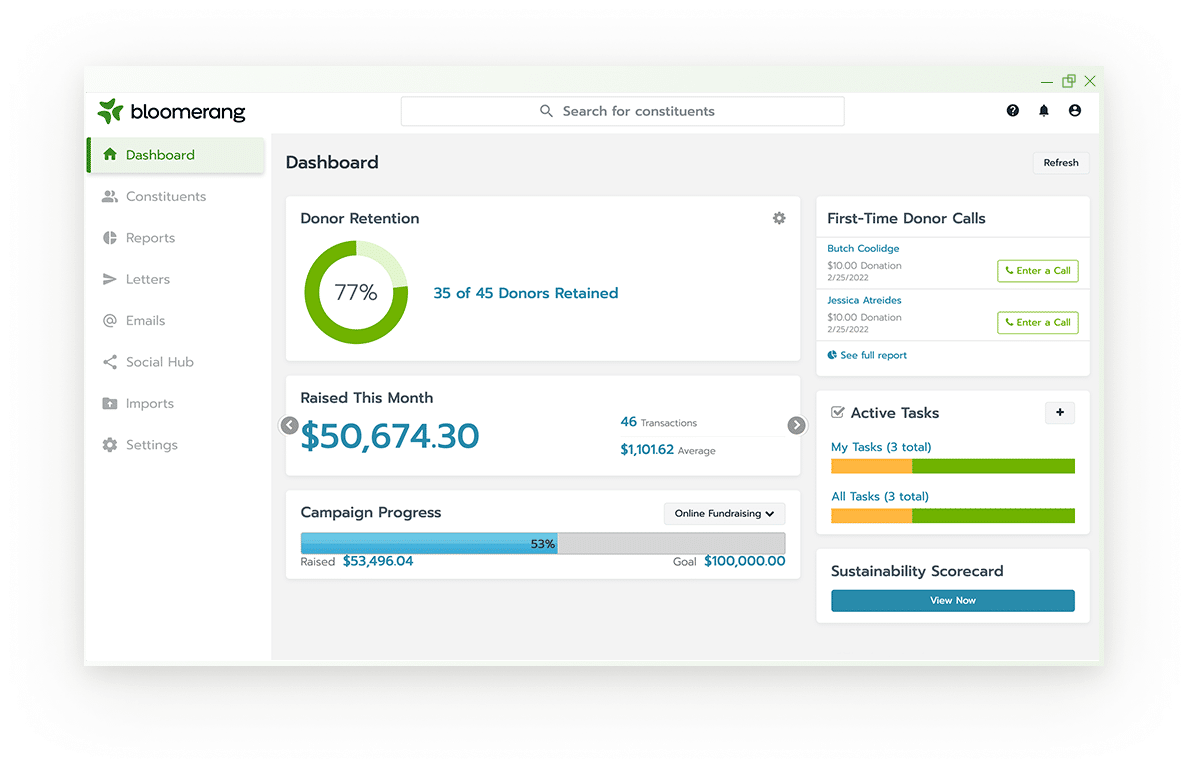 With our interactive dashboard, you can review your donor retention rate, view suggestions for improvement, and see incoming donations for the week/month/year. You can also monitor campaigns, create tasks, and analyze your results in a single place.