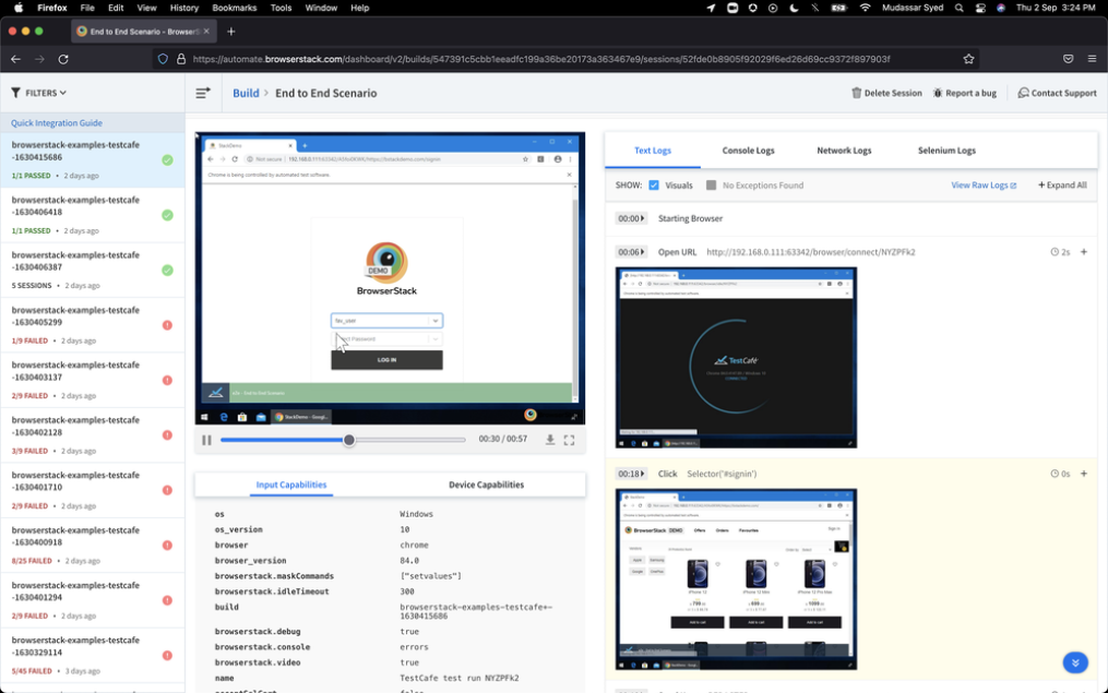Debug with ease using video recordings, automated screenshots of errors, text logs, console logs and network logs.