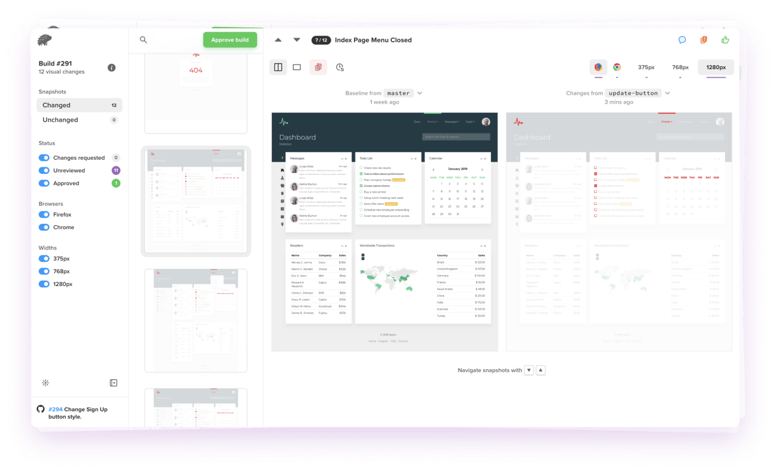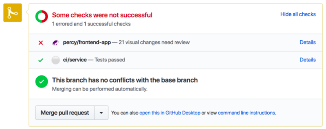 App Percy maintains baselines, branch logic, and approval carry forwards, keeping your reviews in sync with your workflow at all times. Within App Percy, you can either "Approve All" screenshots in an entire build, approve groups of matching visual changes or approve individual screenshots. Once all screenshots in a build are approved, the whole build will be approved.