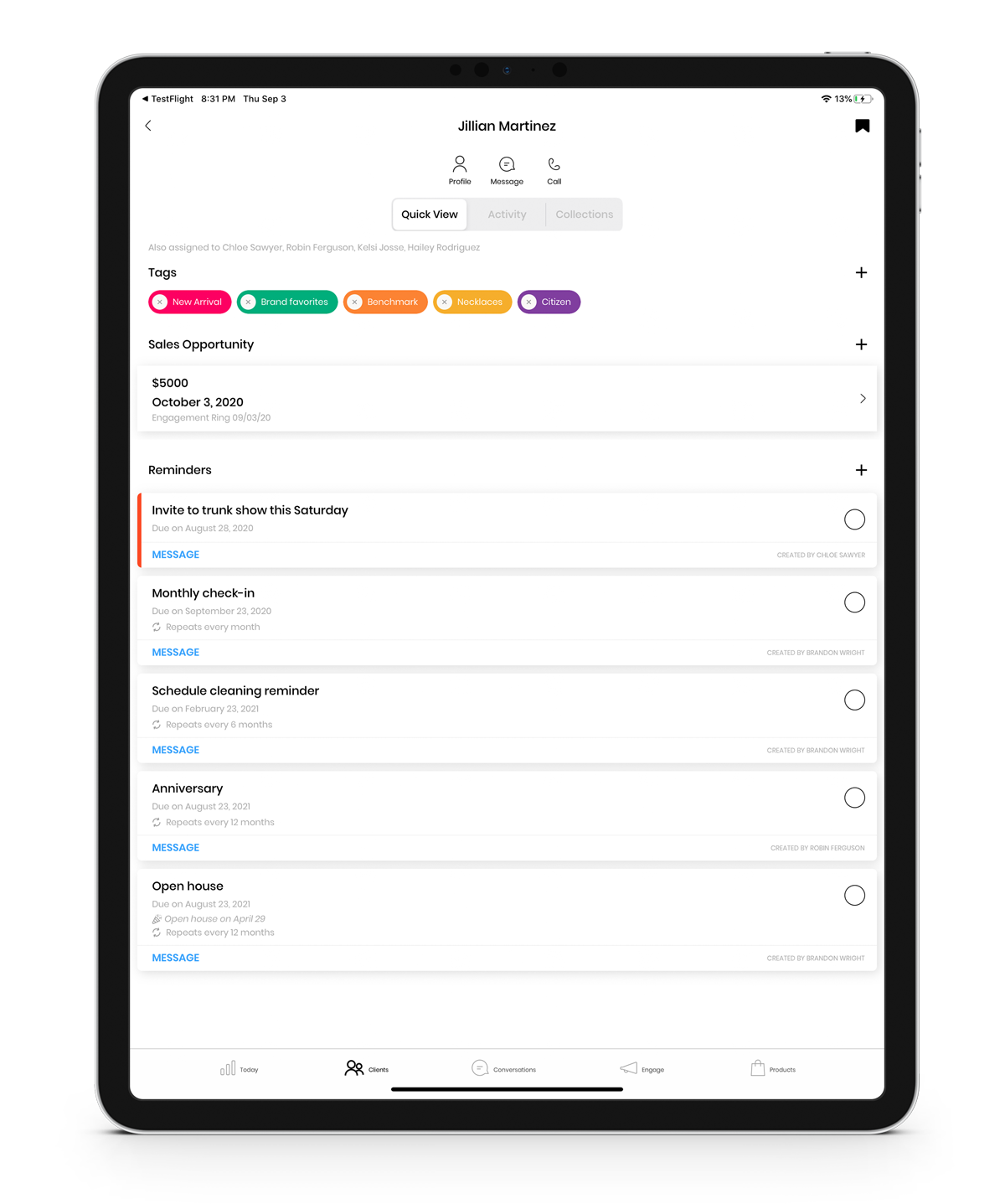 Sales associates waste time reviewing notes on clients, finding who to reach out to, and then calling just to have them not answer. Increase efficiency and effectiveness of the sales team’s clienteling efforts without adding headcount. Tasks and reminders allow the sales associate to focus on what they do best – building relationships – while Clientbook Engagement features create a personalized touchpoint without taking your sales team from the floor.