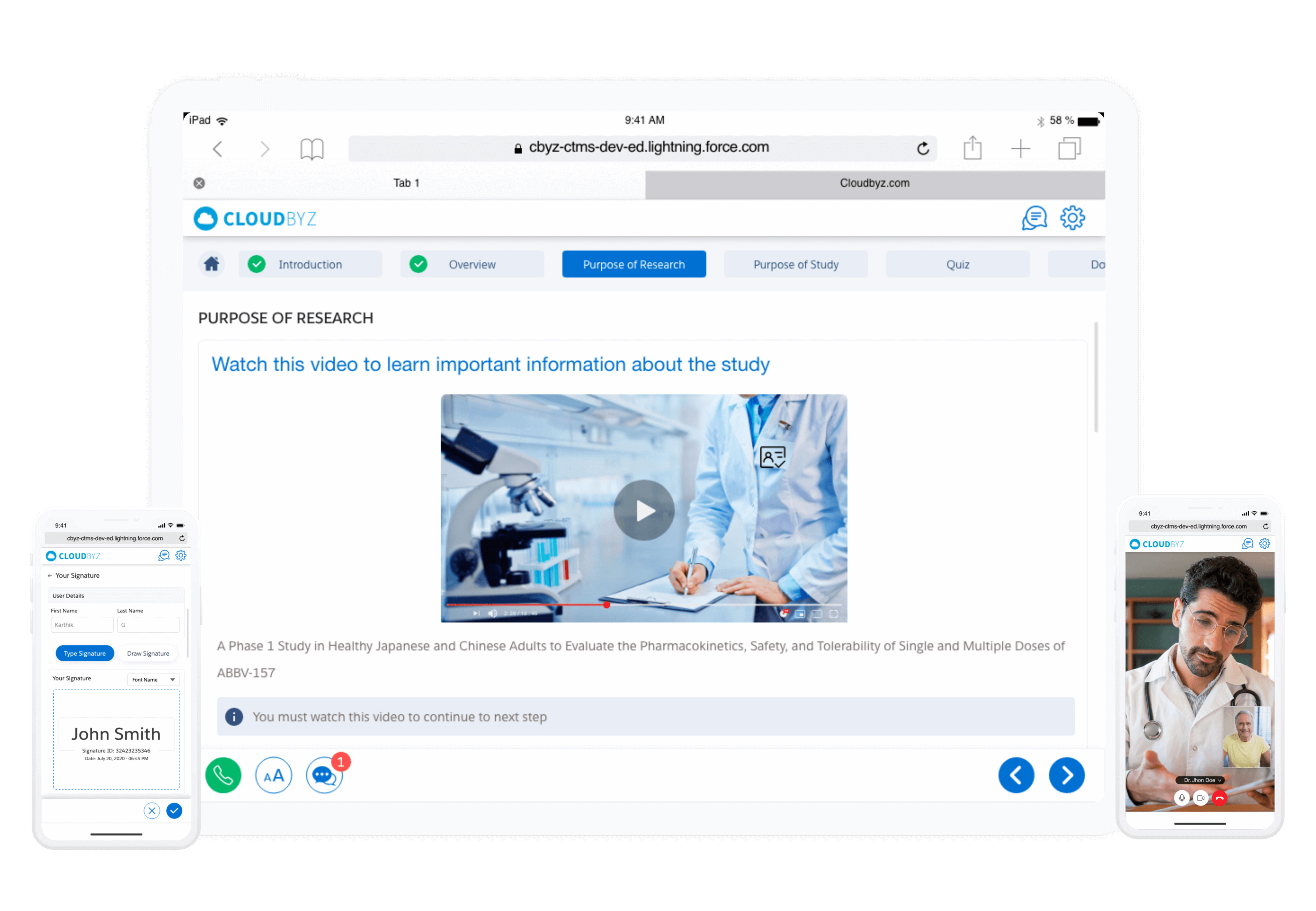 Cloudbyz eConsent solution enables real-time document management of informed patient consent and e-signature with multi-gadget configurability. It includes template-based and interactive multimedia approaches to expand the scope of eligibility testing.