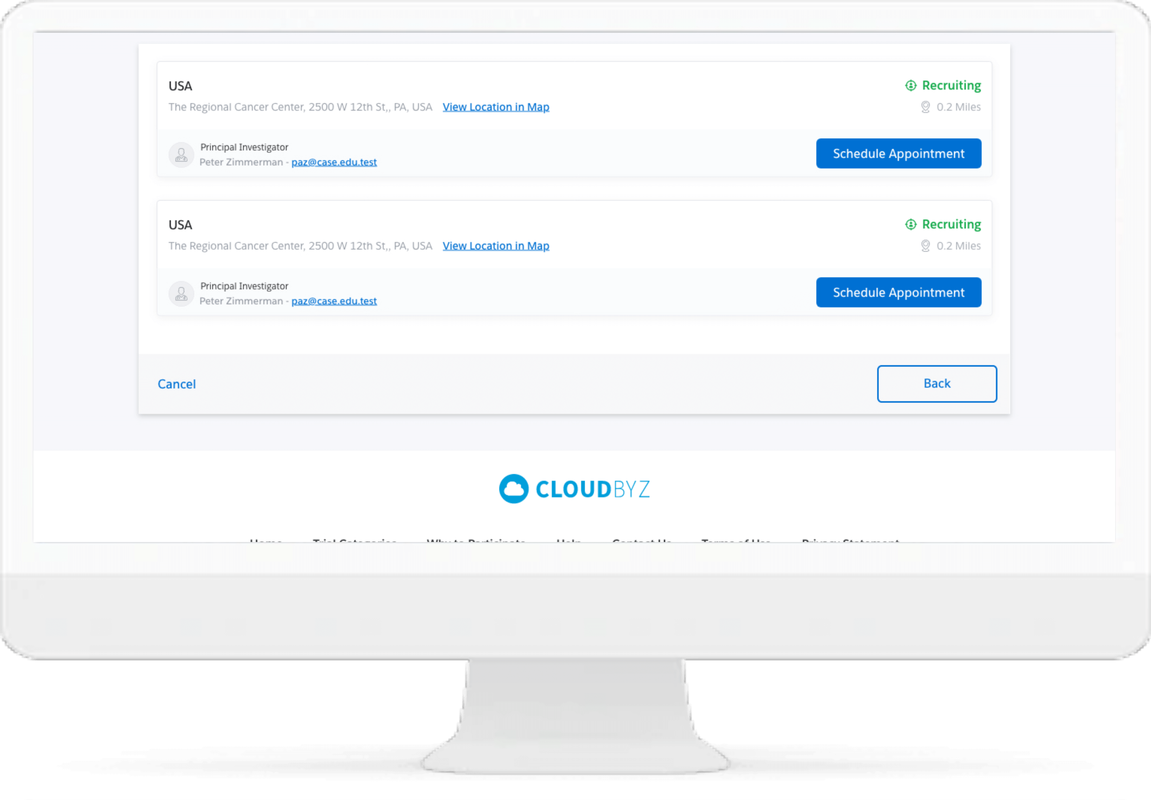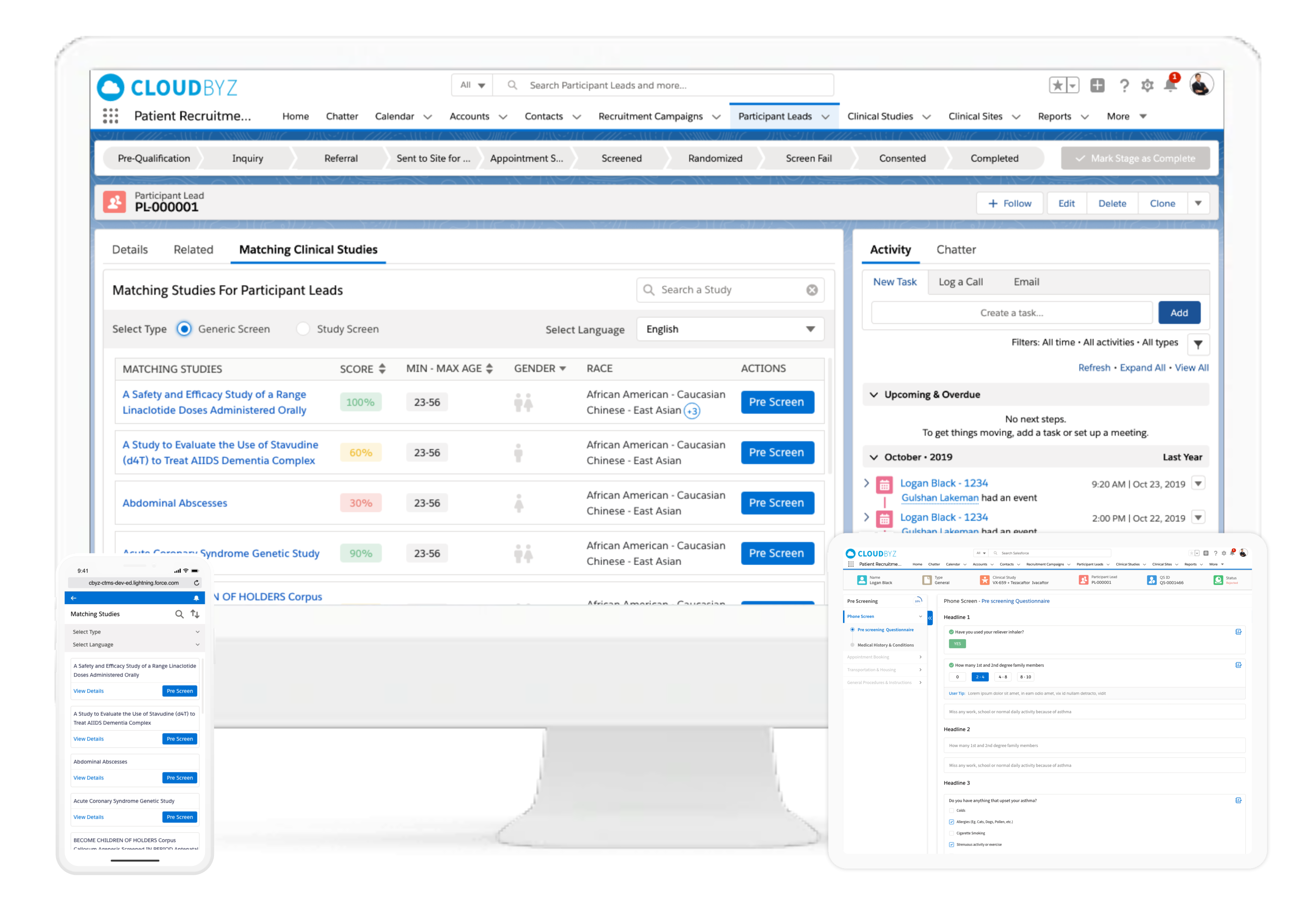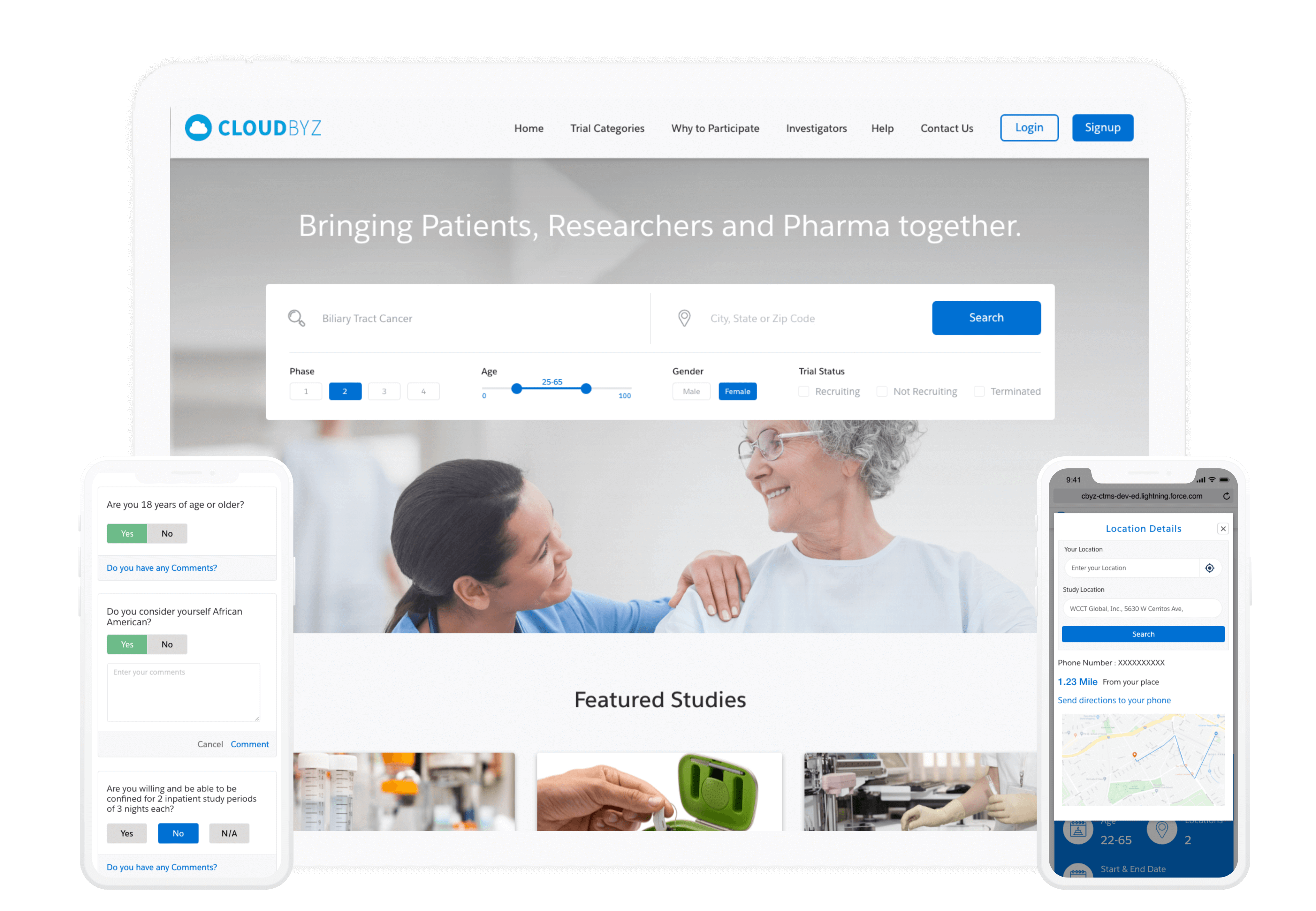 Cloudbyz DCT solution facilitates end-to-end virtual patient recruitment globally. We deliver capability in study listing, patient portal, pre-screening, participant interest form templates, appointment scheduling, campaign management, etc.
