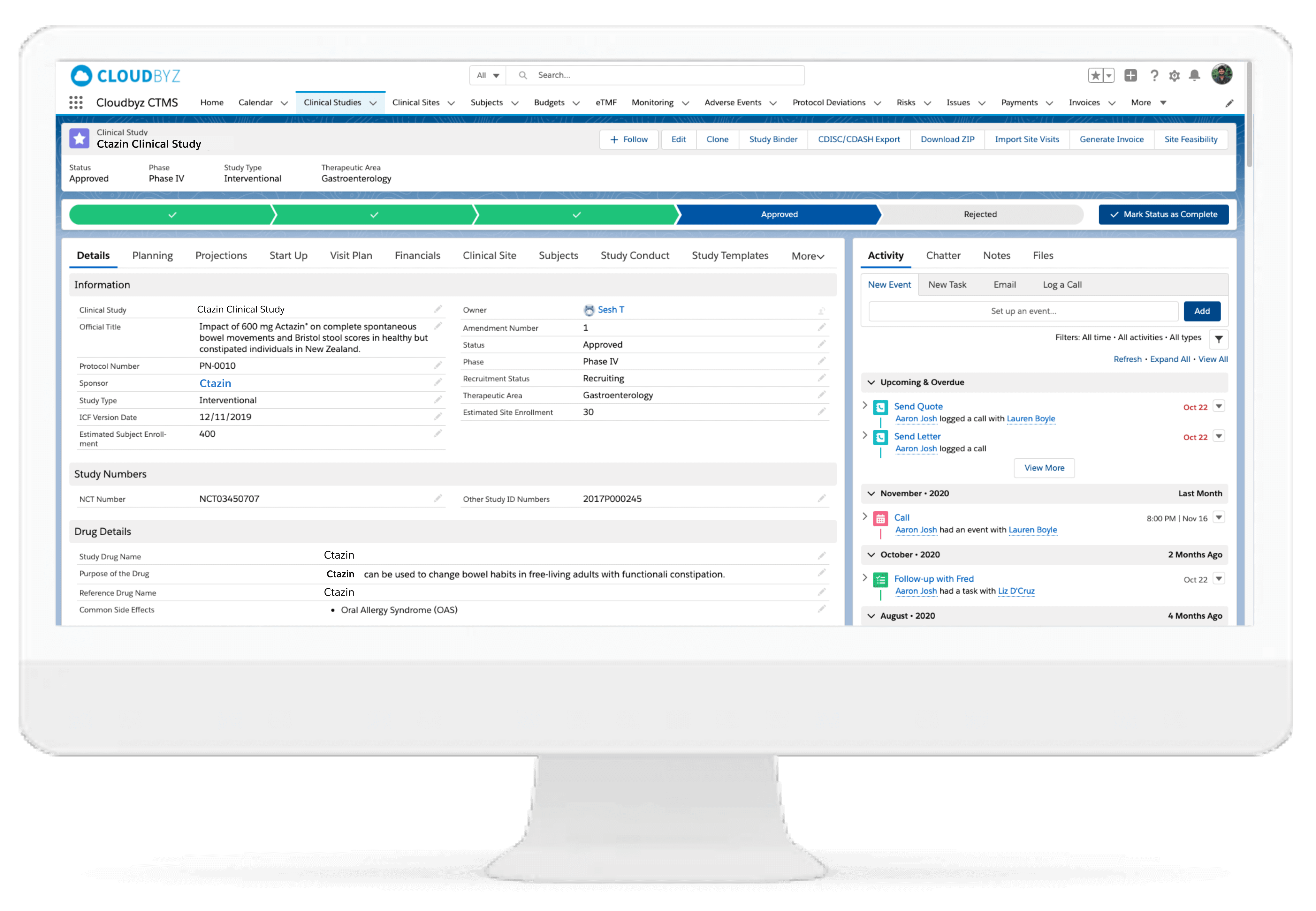 Cloudbyz enables comprehensive study, site and end-to-end project management of the clinical trials through its different CTMS modules. It delivers complete off-site and hybrid-based process streamlining including site feasibility study, report monitoring, study management, IRB approval tracking, training, real-time performance tracking, among others.