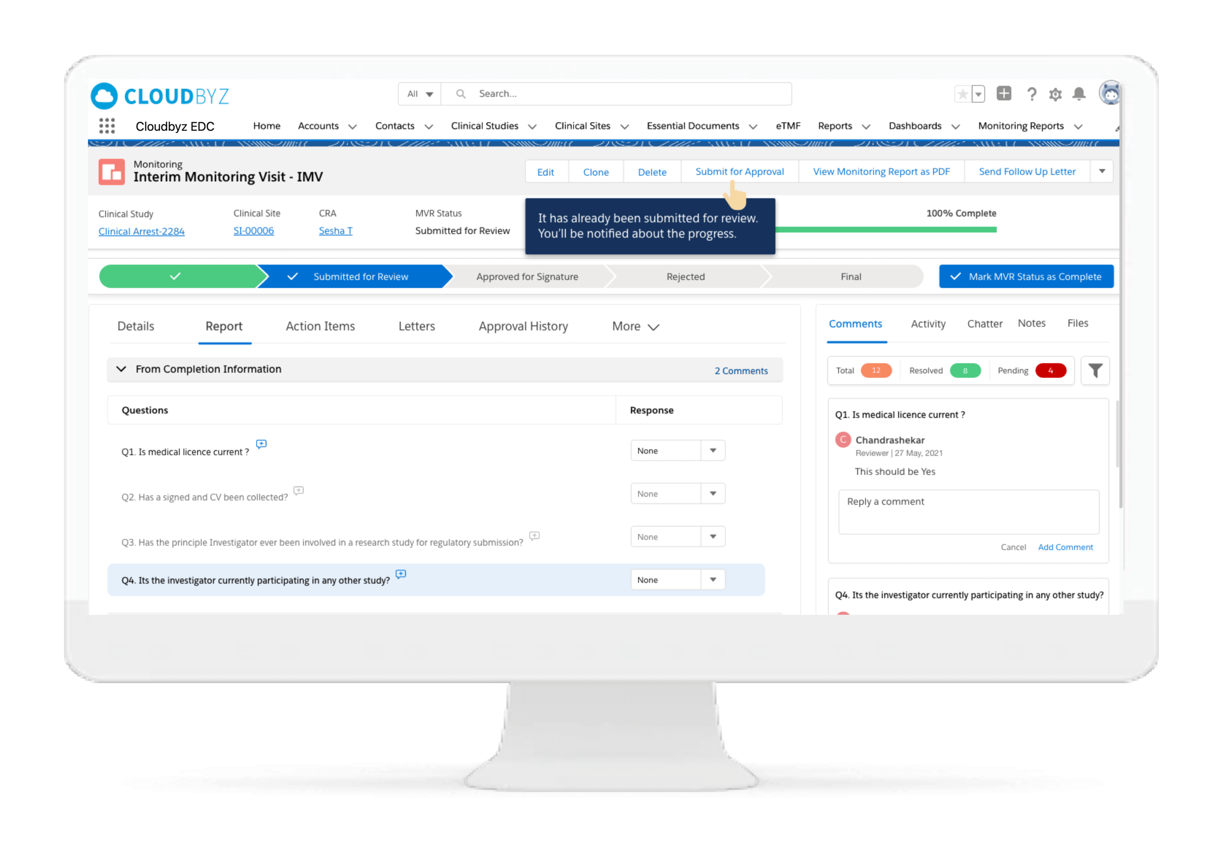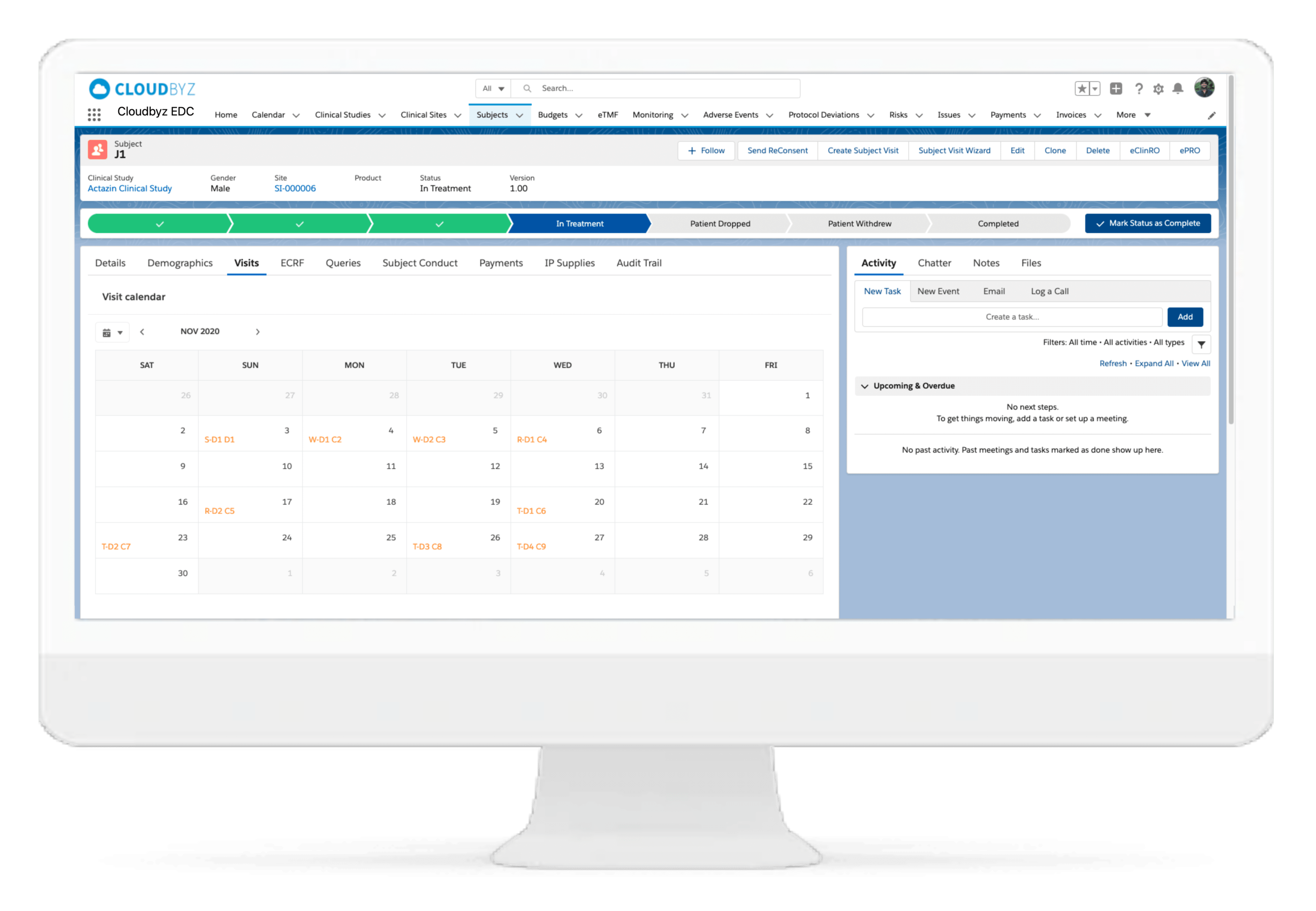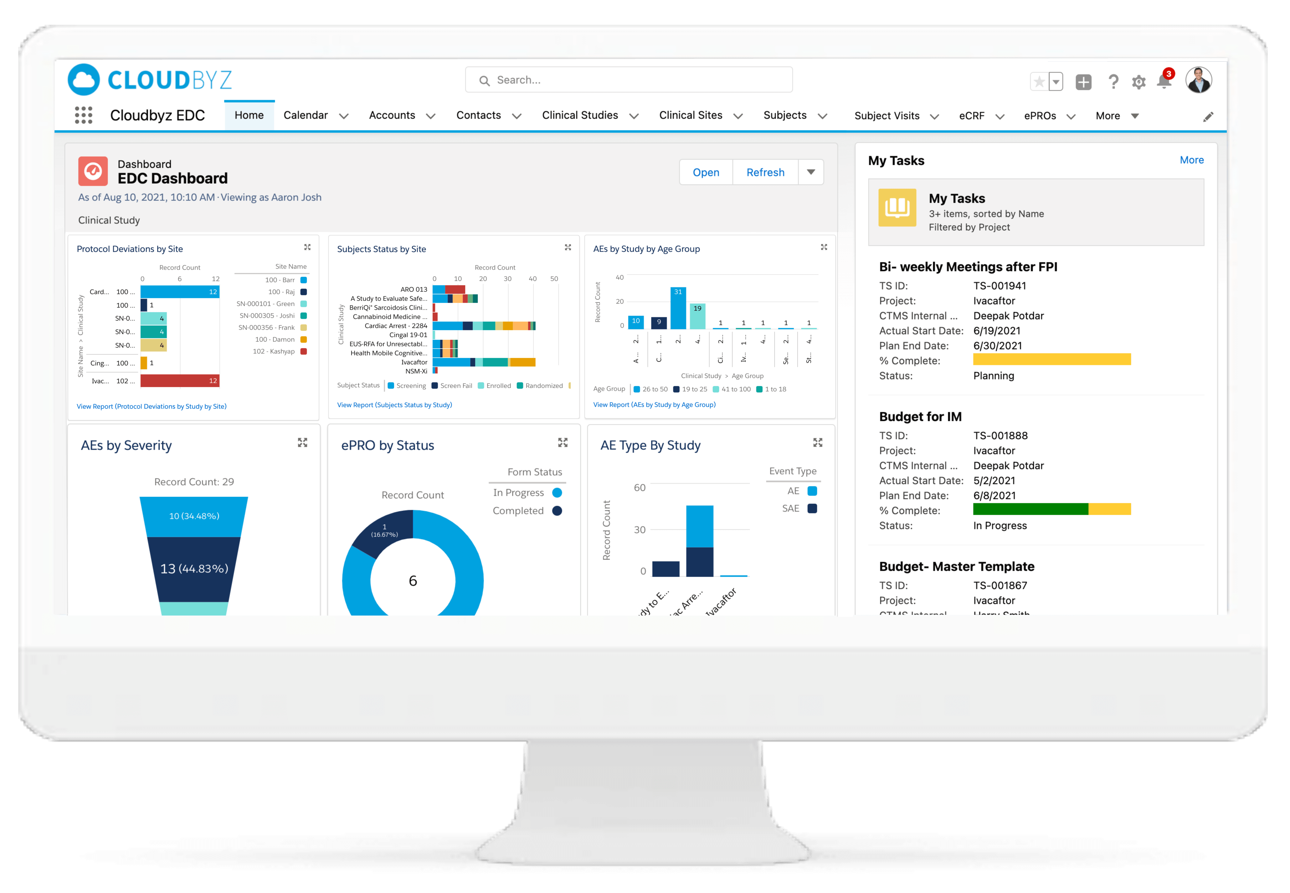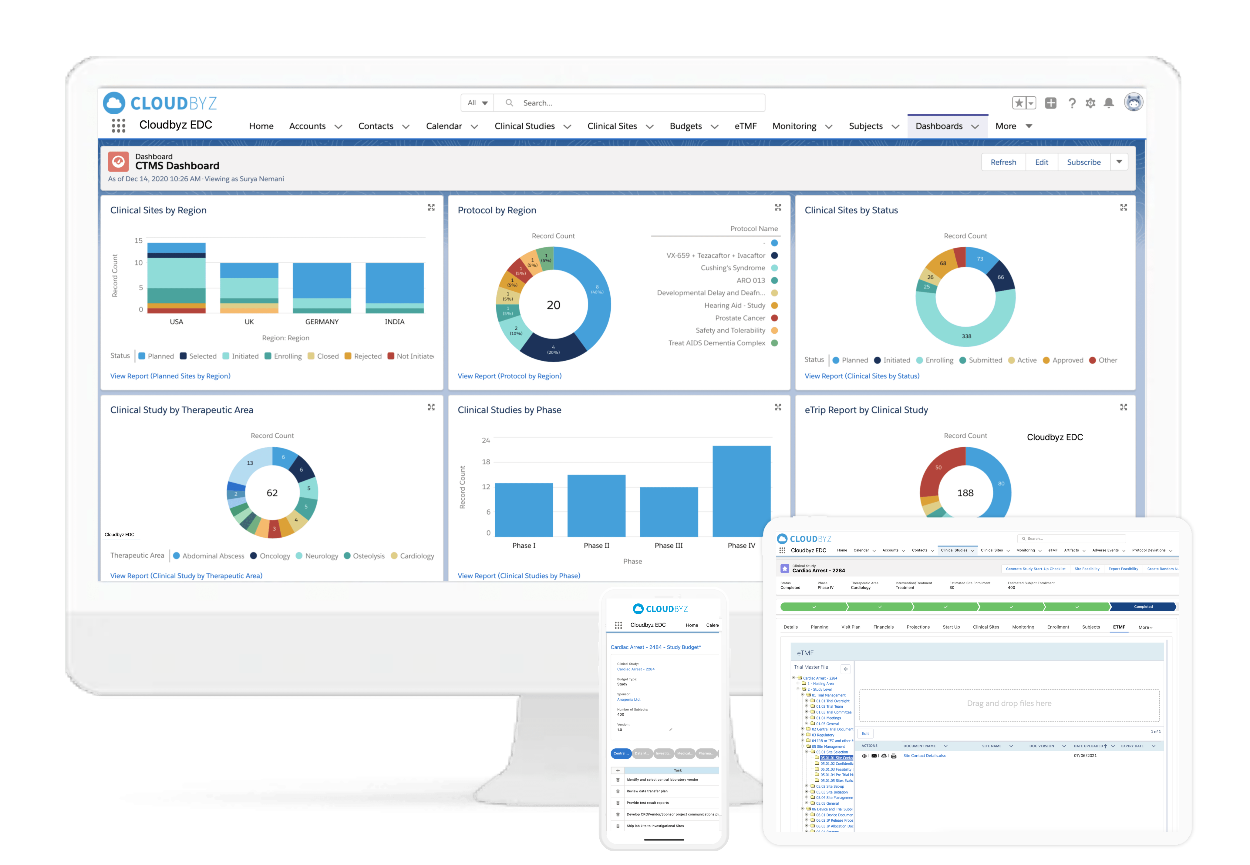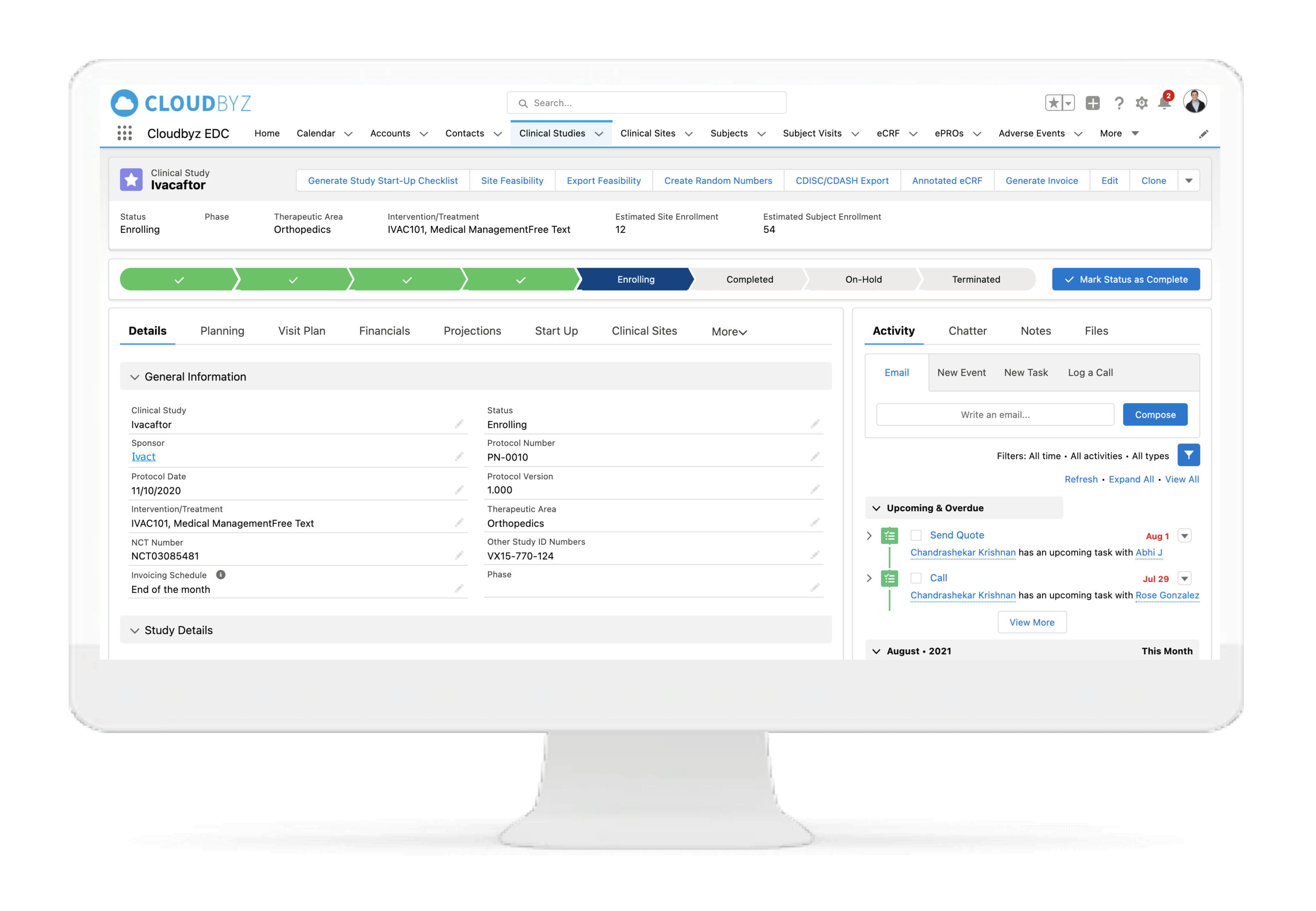 Cloudbyz DCT solution offers end-to-end project management of the clinical trials. It supports in-depth site feasibility study, monitoring, study management, IRB approval tracking, training, real-time performance tracking, among others. The Cloudbyz EDC can be integrated to the CTMS for easy extraction of data directly on to the specified fields of the eCRFs.