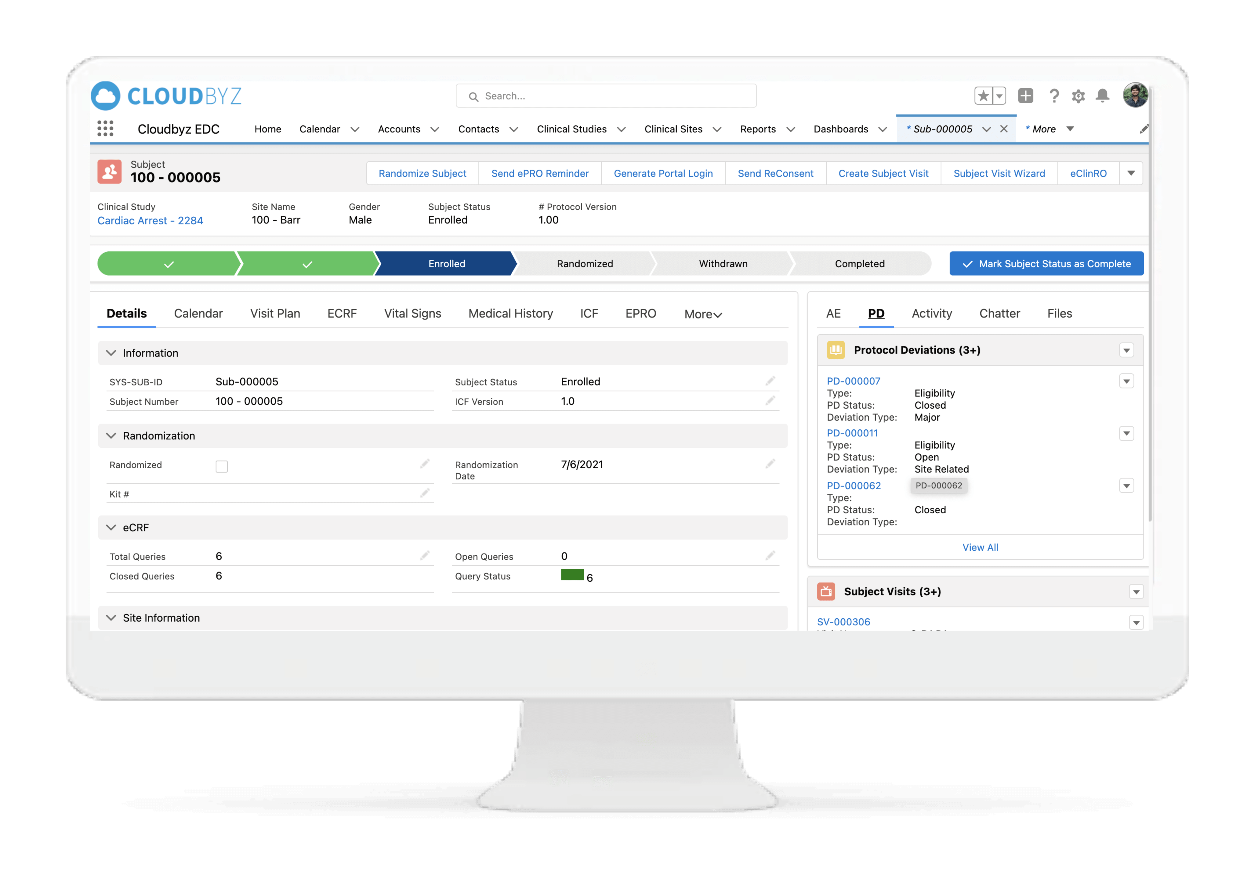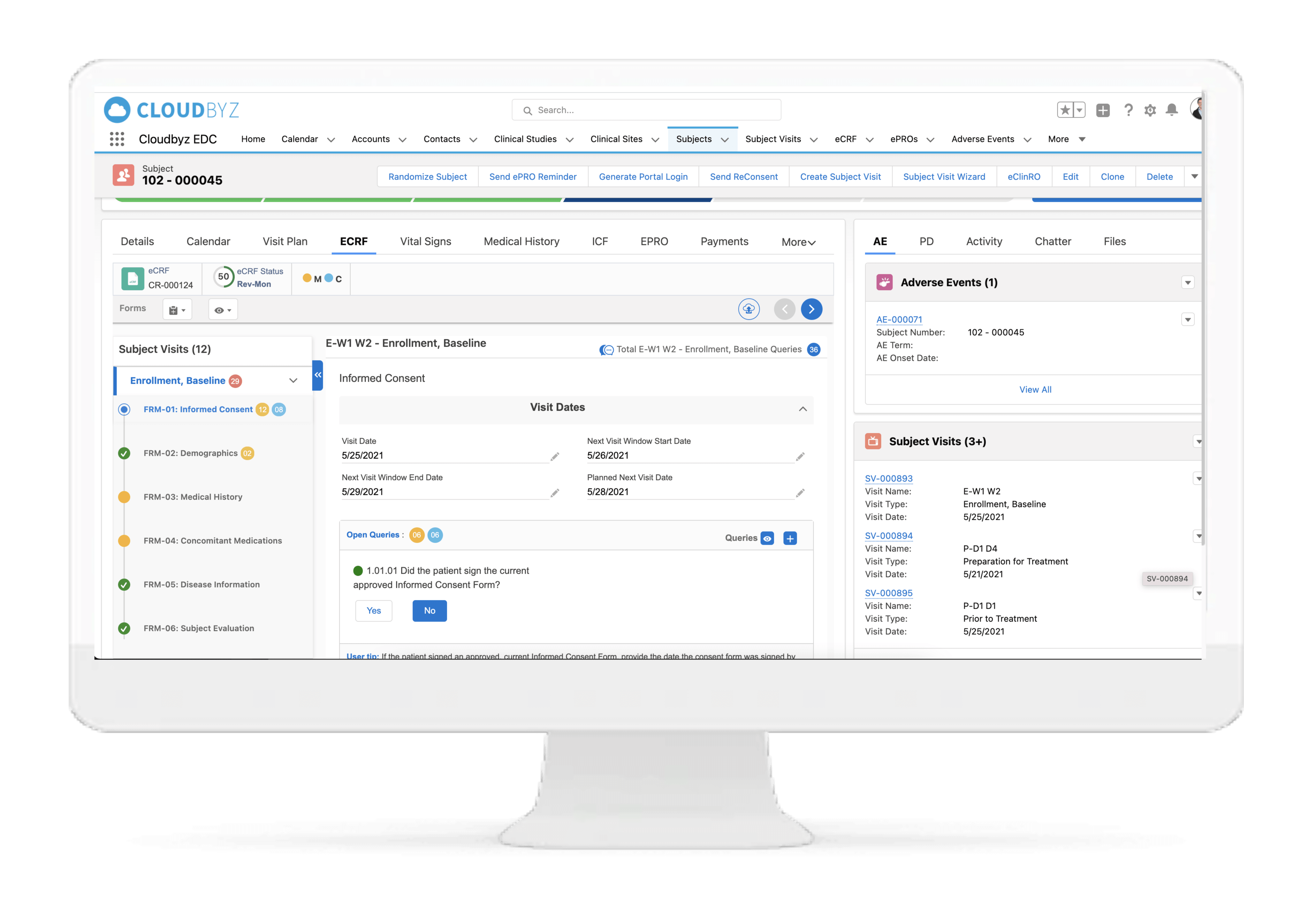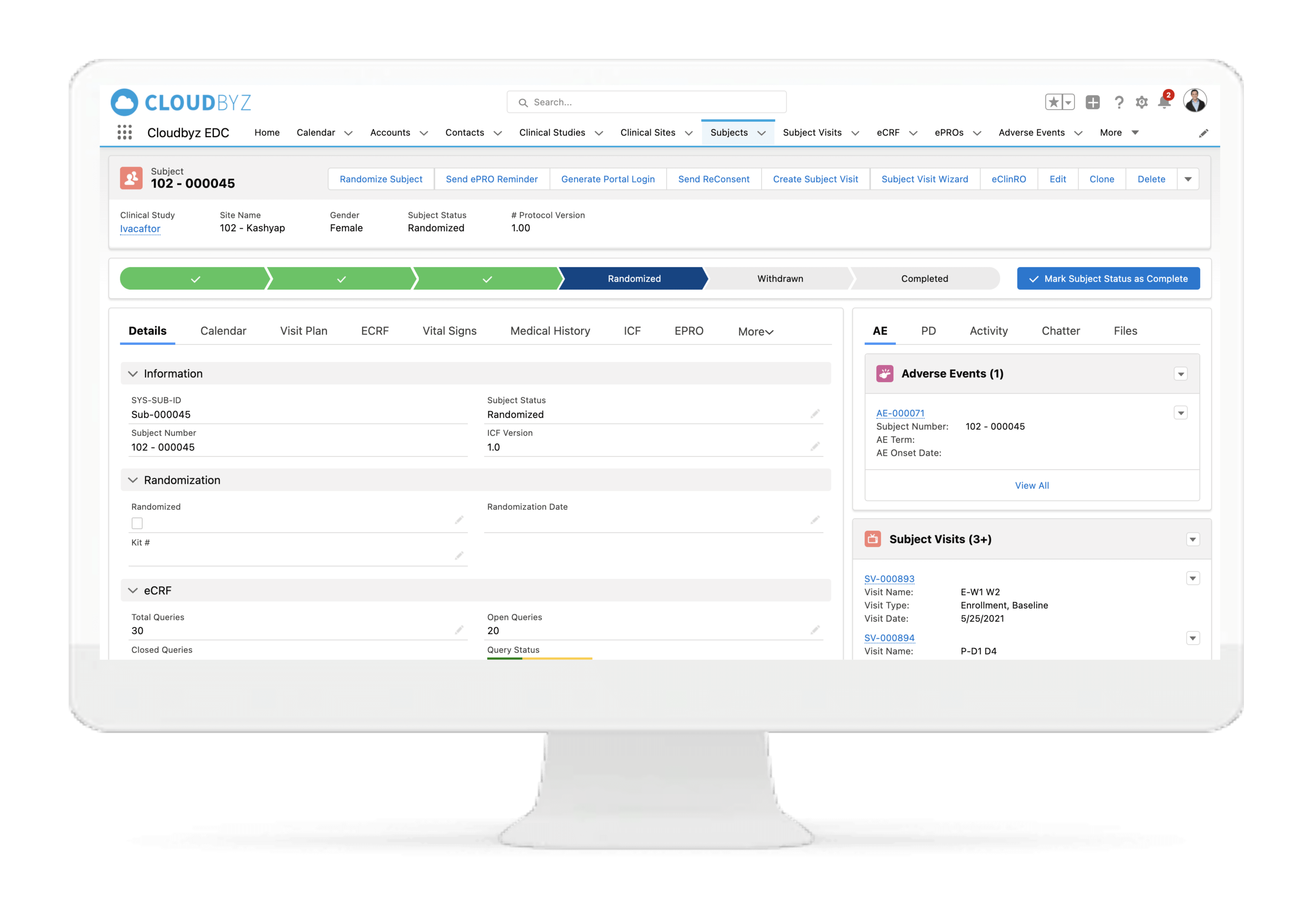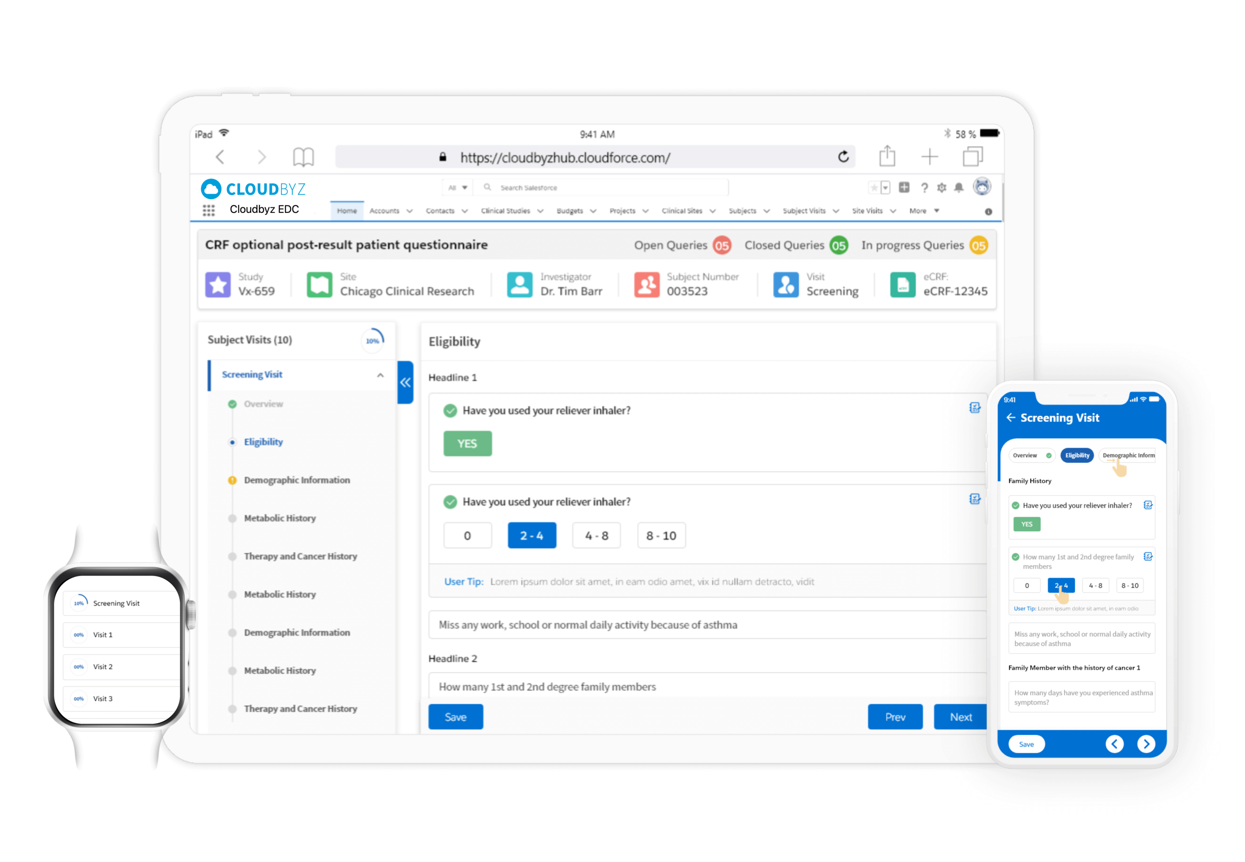 Cloudbyz eCRF (electronic case report form) is a cloud-based, easy-to-use solution that enables rapid data collection, more efficient data cleaning and an overall decrease in the efforts and costs involved in the data management process. Our solution, built on the Salesforce platform, is 21 CFR part 11 compliant and has features such as data back-up, multi-language abilities, security features such as access control and data encryption, multimedia content support and customizability.