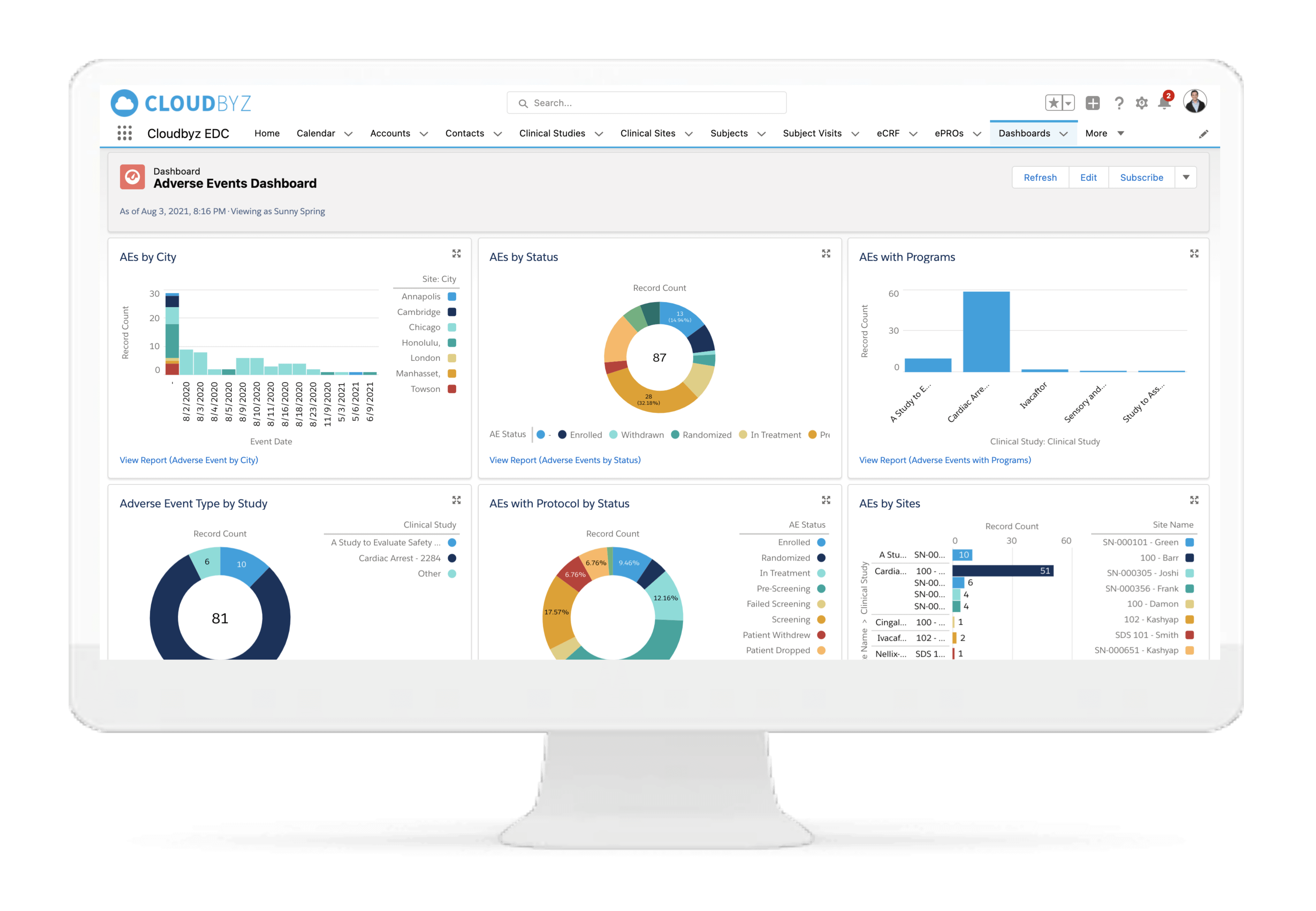 The cloudbyz EDC offers ready to use and customized reports and dashboards to track various metrics. Reports can be created with a point and click configuration to track metrics such as enrollment numbers, protocol deviations, adverse events, queries