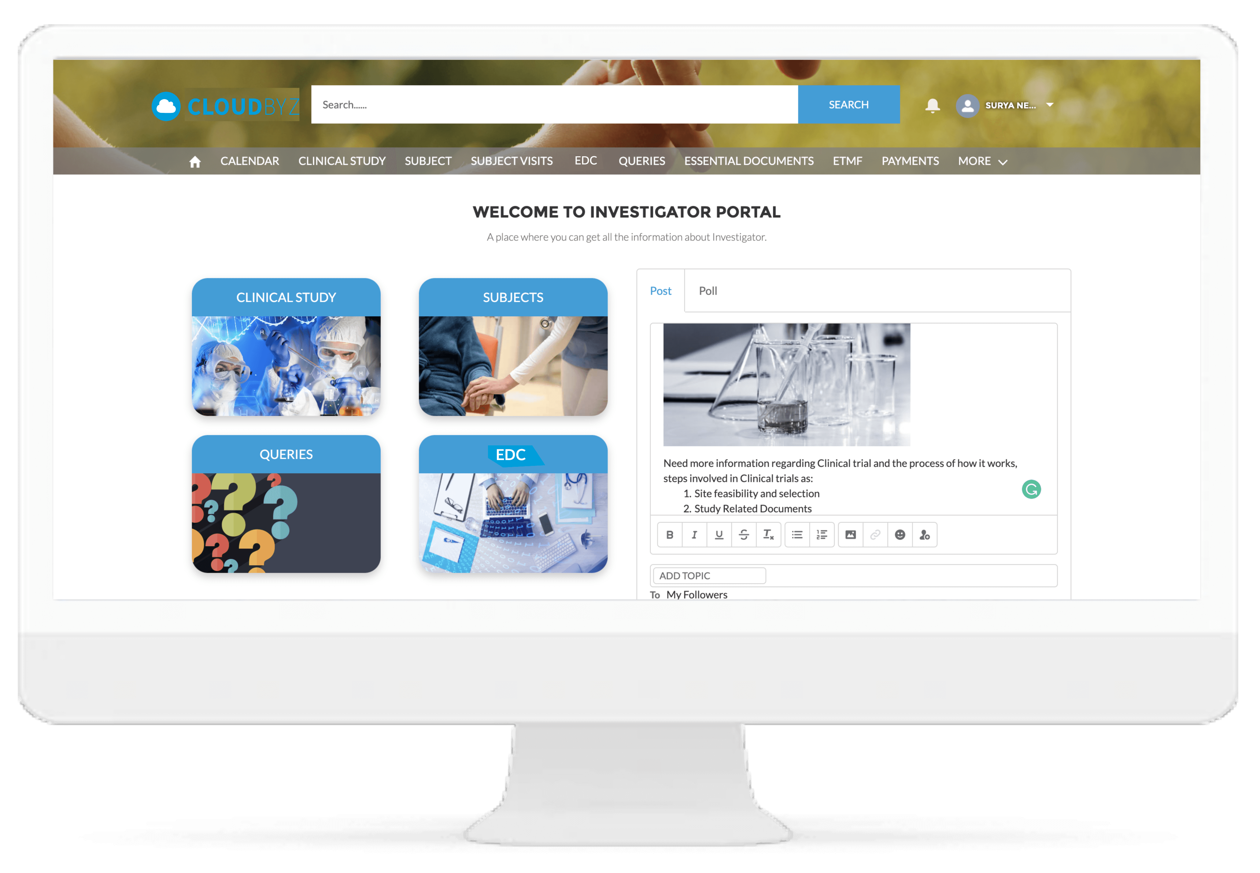 Cloudbyz Investigator Portal solution provides a single platform to deliver content and services to clinical research sites. With investigator portal, sites can complete eCRFs, report protocol deviations and adverse events, maintain eISF (Electronic investigator Site File), access study information, collect essential documentation, perform investigation product accountability, and communicate with monitors, CROs, Sponsors and other vendors, all from single location.