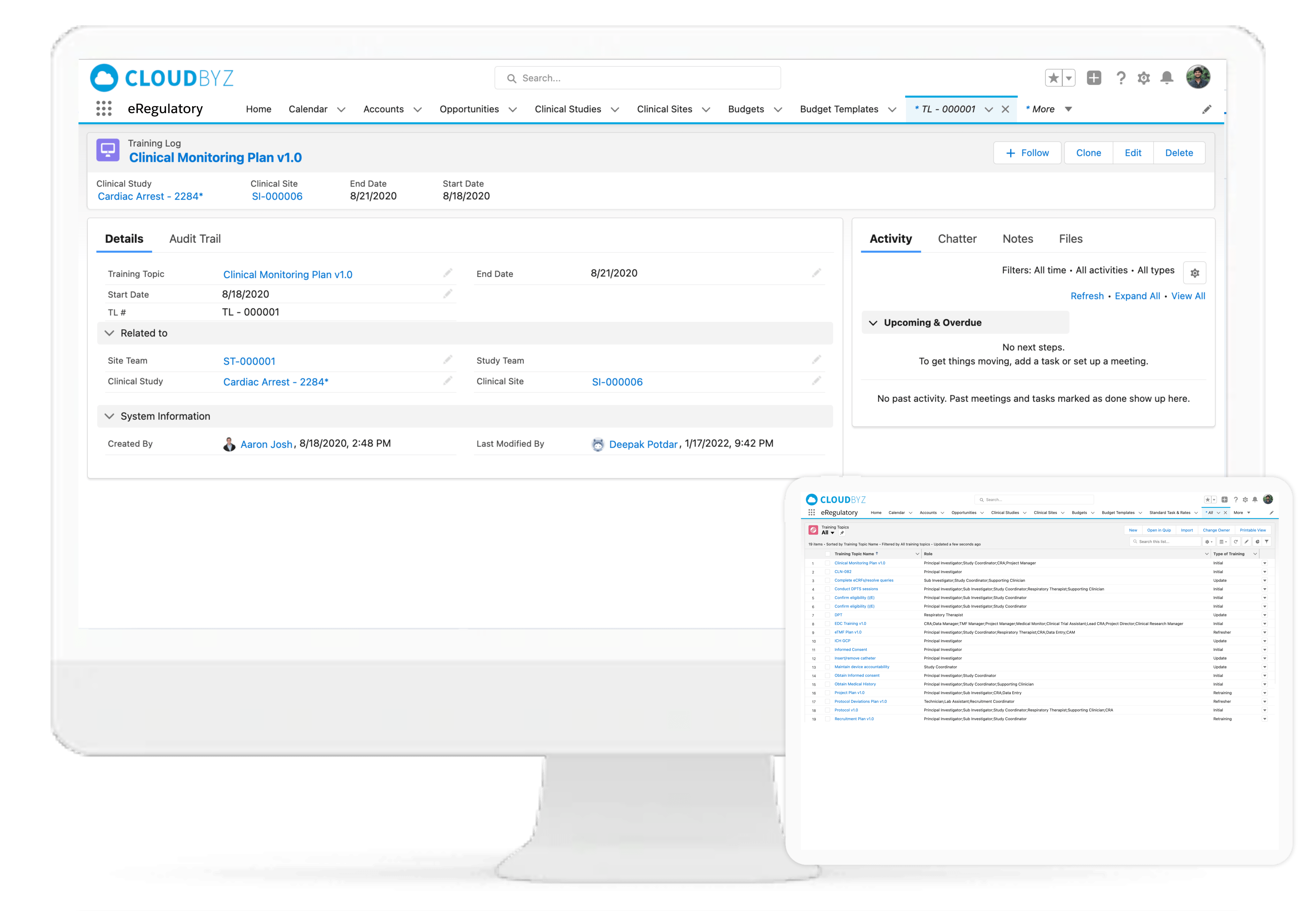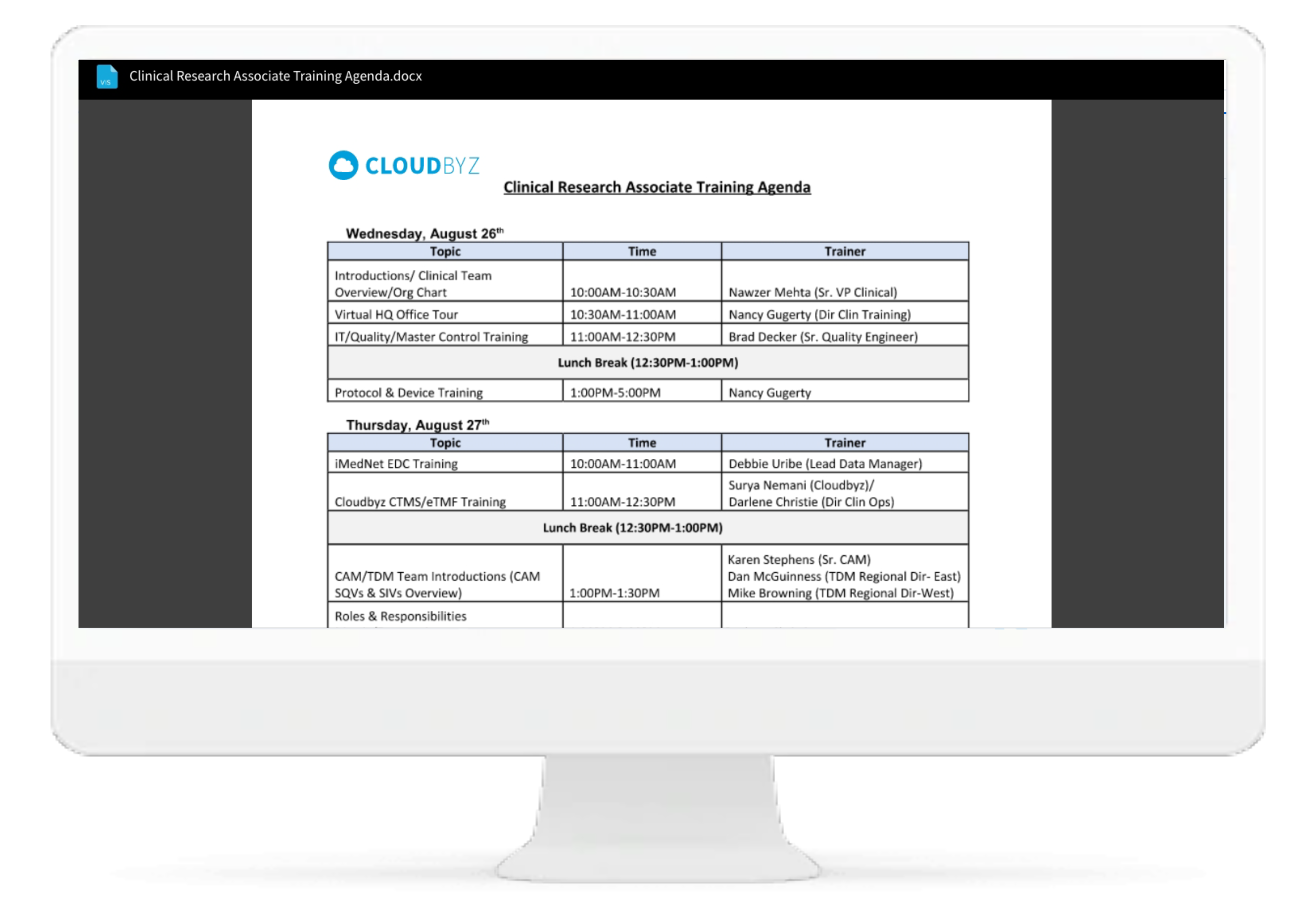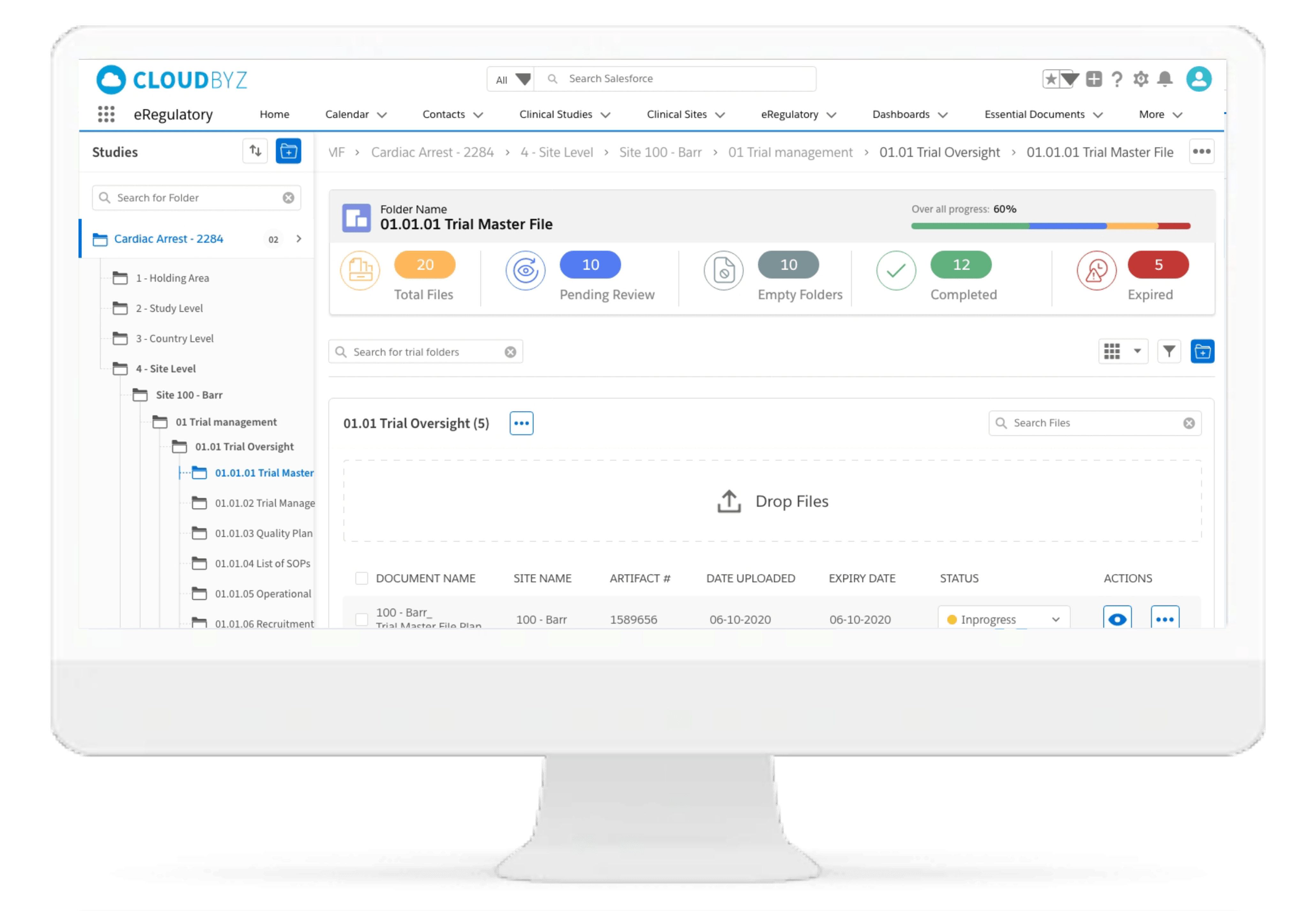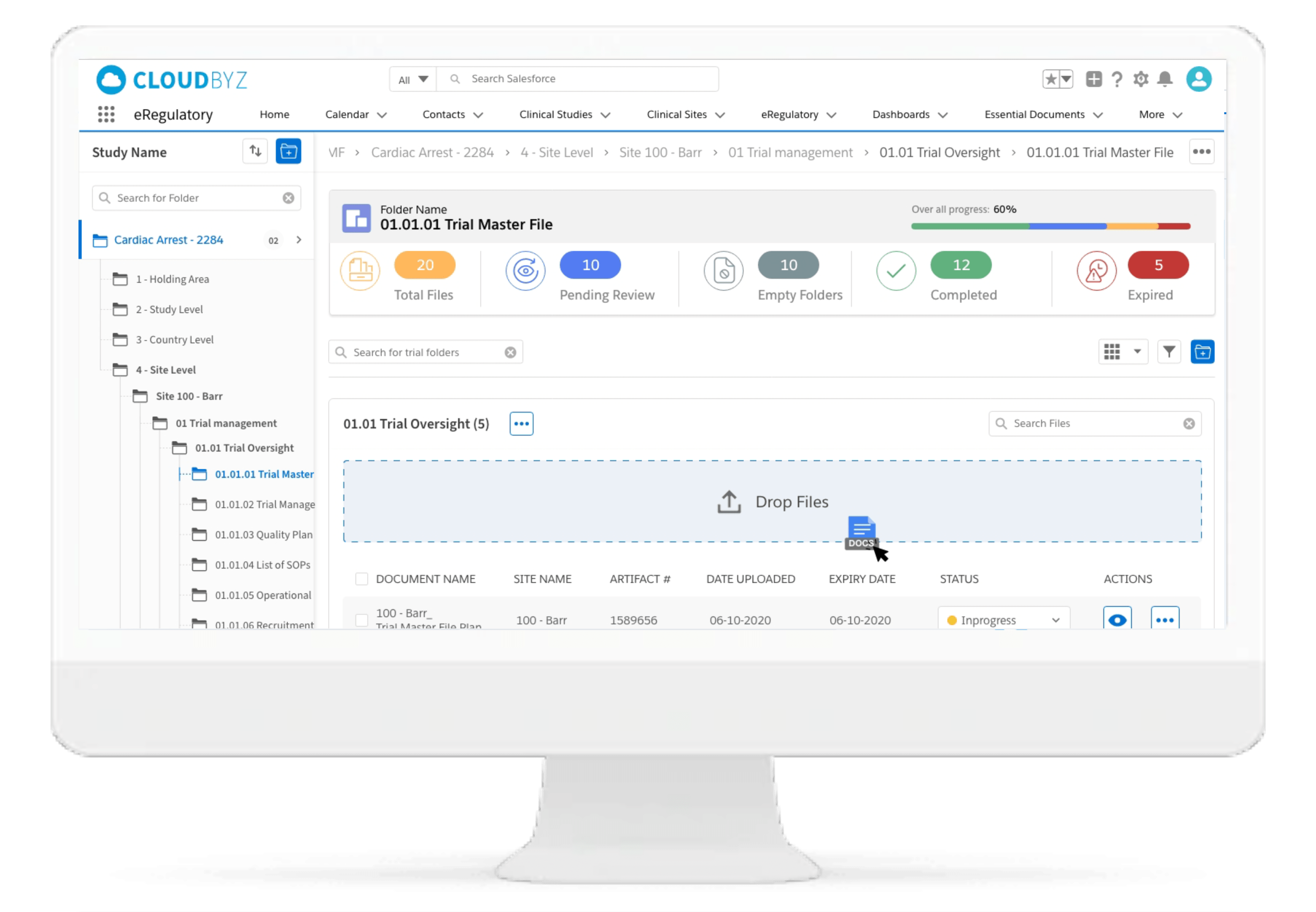 Cloudbyz eRegulatory solution offers a cloud-based repository forof all your clinical trial documents. Digitally capture, manage, share, and store all clinical trial-related documents with a centralized overview. Manage essential trial documents, stay inspection ready, and enable real-time visibility for CROs, sponsors, monitors, and other stakeholders in a clinical trial.