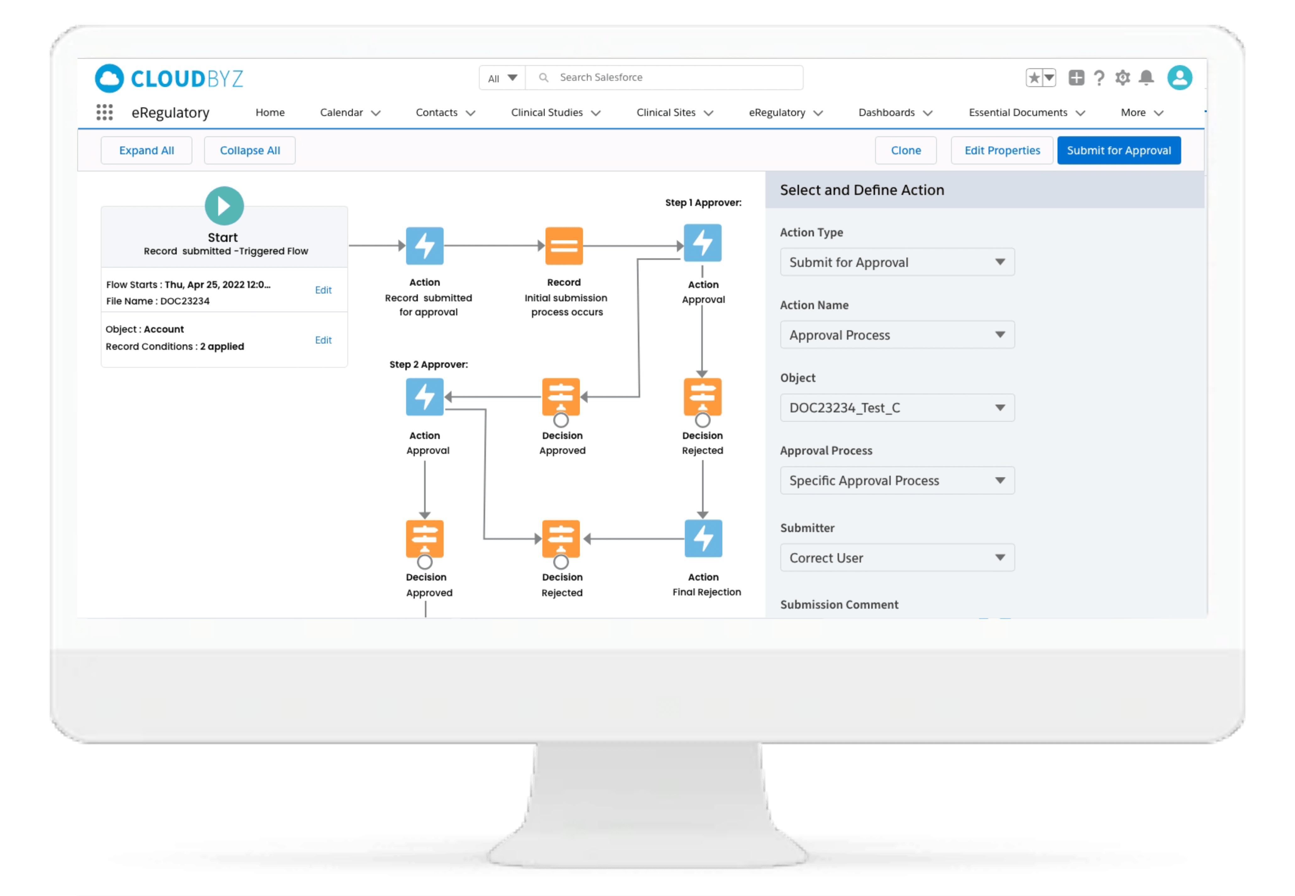 Cloudbyz eRegulatory comes with point and click and drag and drop configurable workflow and approval process engine which enables customers to configure their own approval process and workflow automation.