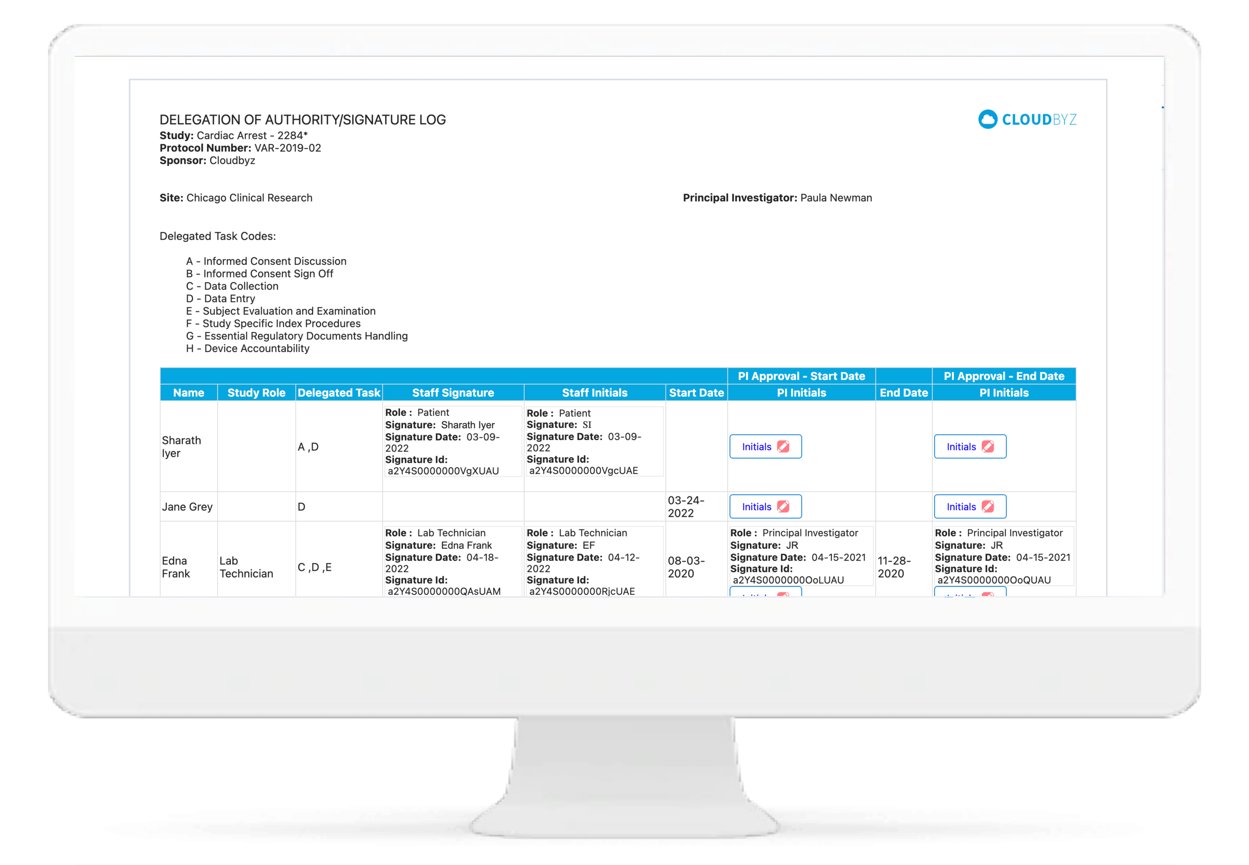 Cloudbyz eRegulatory solution comes with automatic generation of electronic delegation of authority log (eDOA) based on the team roles and assigned responsibilities. The study team can sign on the eDOA log through inbuilt electronic signatures. The log can be maintained live for the entire duration of study and can be generated for filing into the site binder and/or the eTMF.