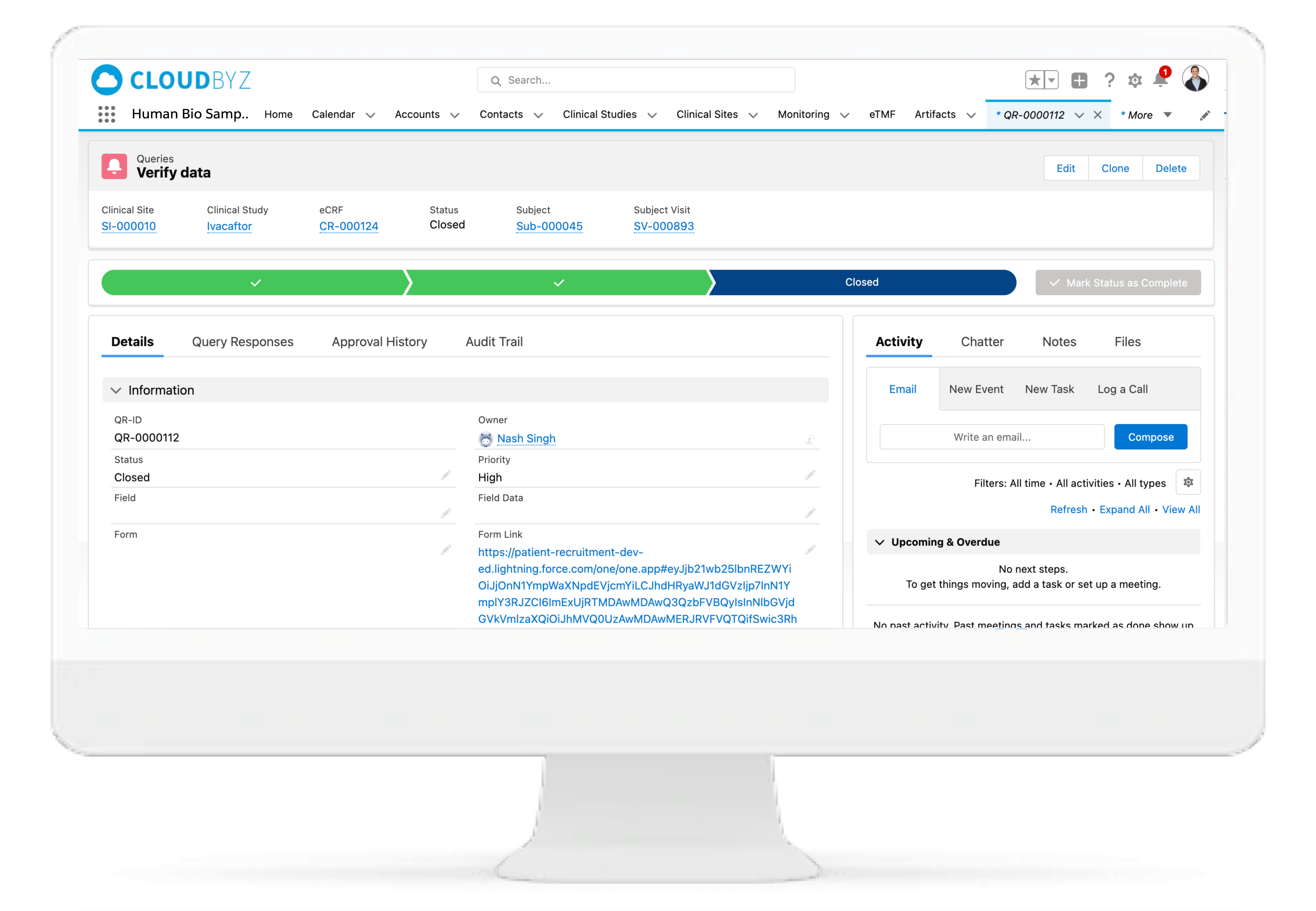 Cloudbyz Query Management solutions provide efficient communication between sample accessioning and processing teams, data managers and coordinators. Features include automated query generation, posting the queries into the system, real-time notifications, review of site responses, reissuing/closing of the queries and generation of custom dashboards and reports for query tracking and metrics.