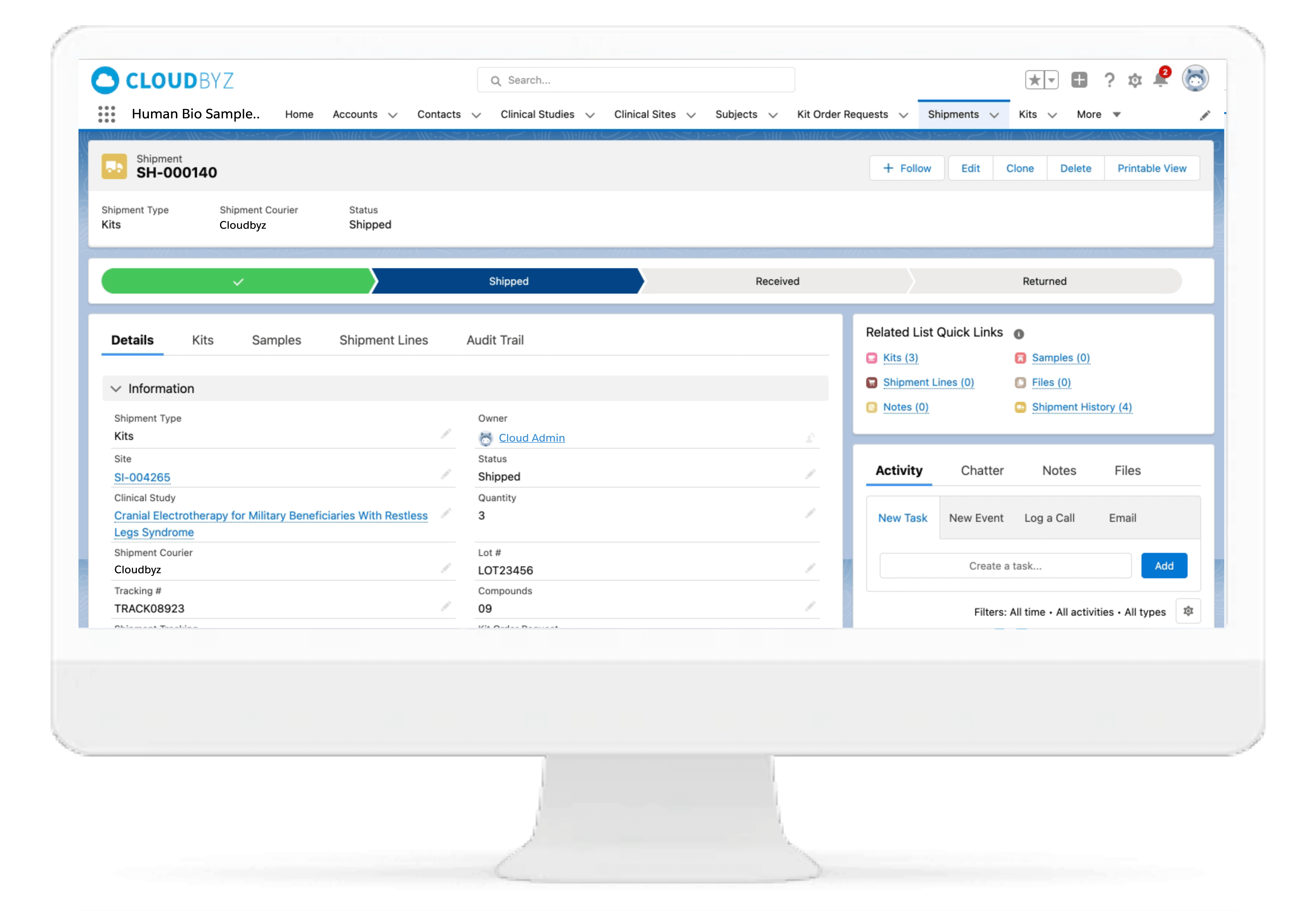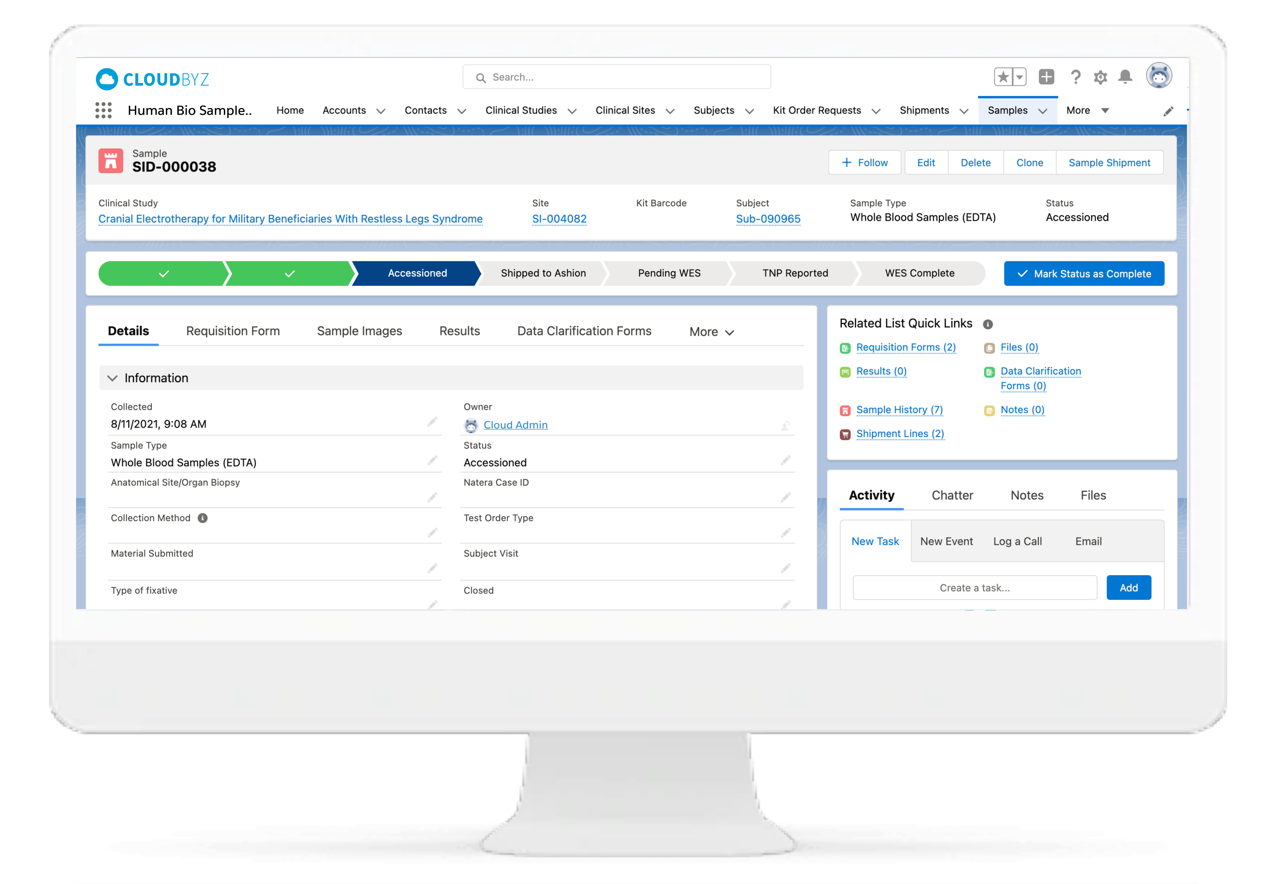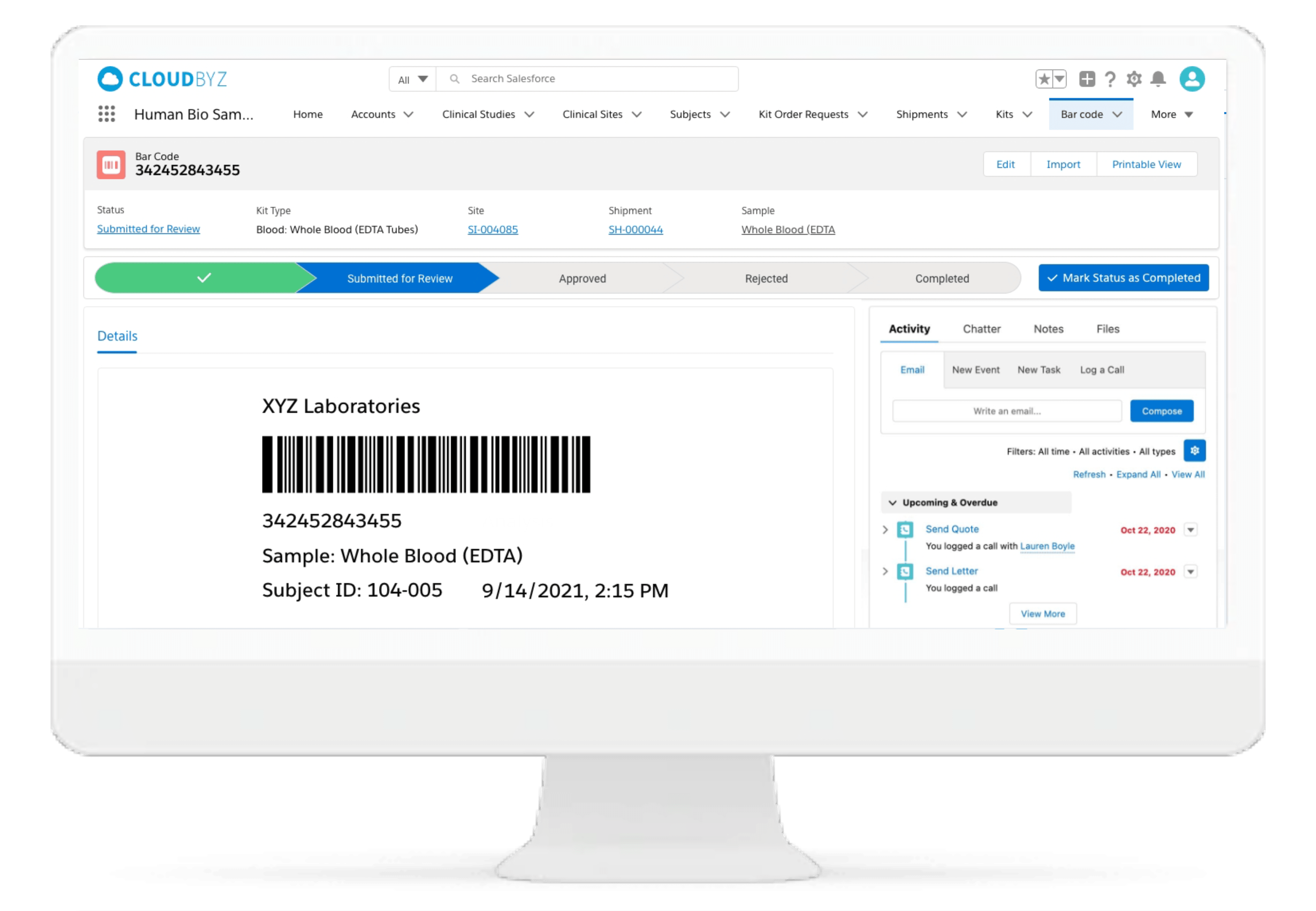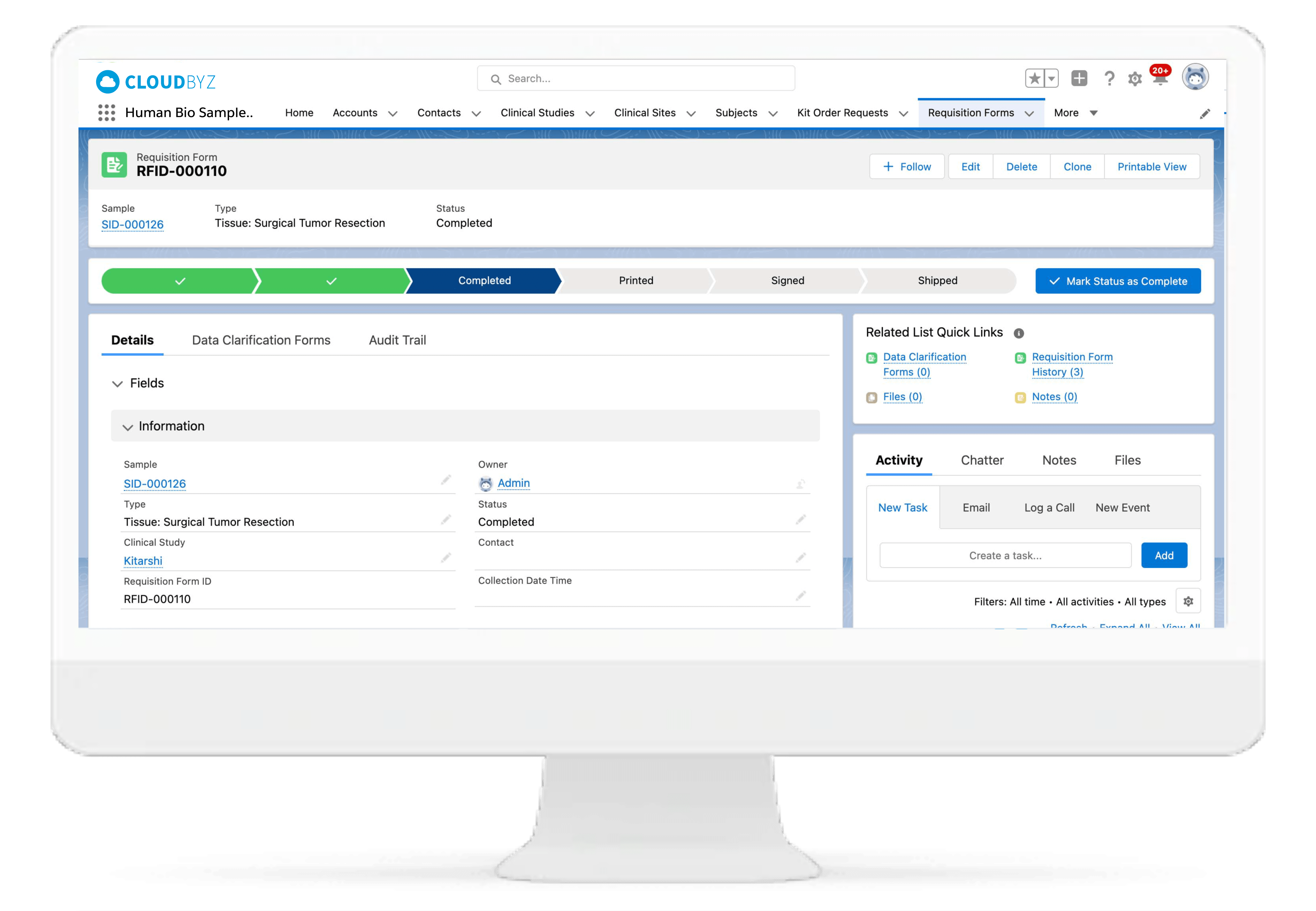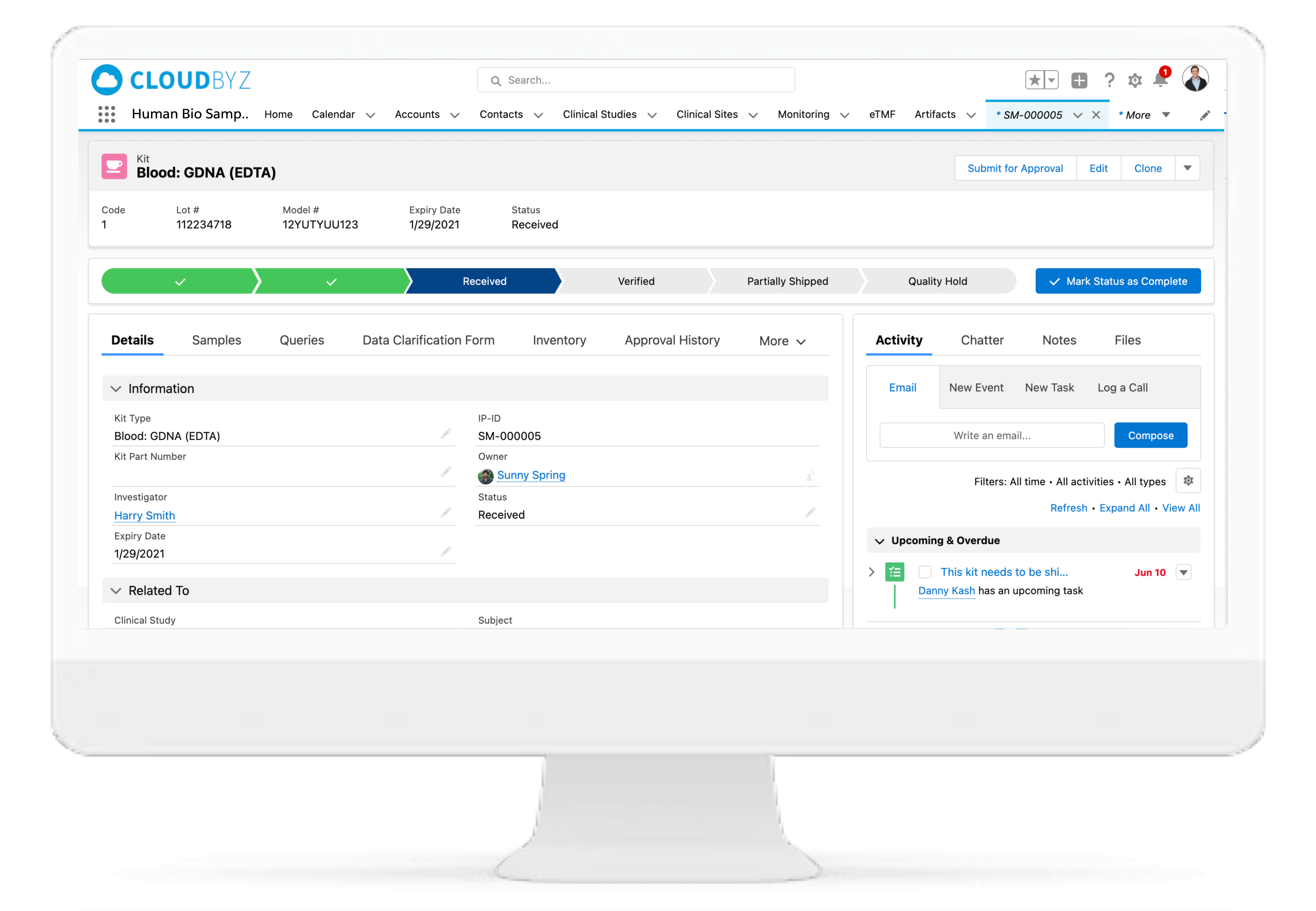 Cloudbyz Human Bio Sample Management is an end-to-end solution that is completely customizable per the requirements of a clinical study. It is a cloud-based solution designed to be simple while providing powerful sample and kit management capabilities and characteristics. It allows for collaborative studies, electronic sample requisition forms, data clarification forms and inventory management.