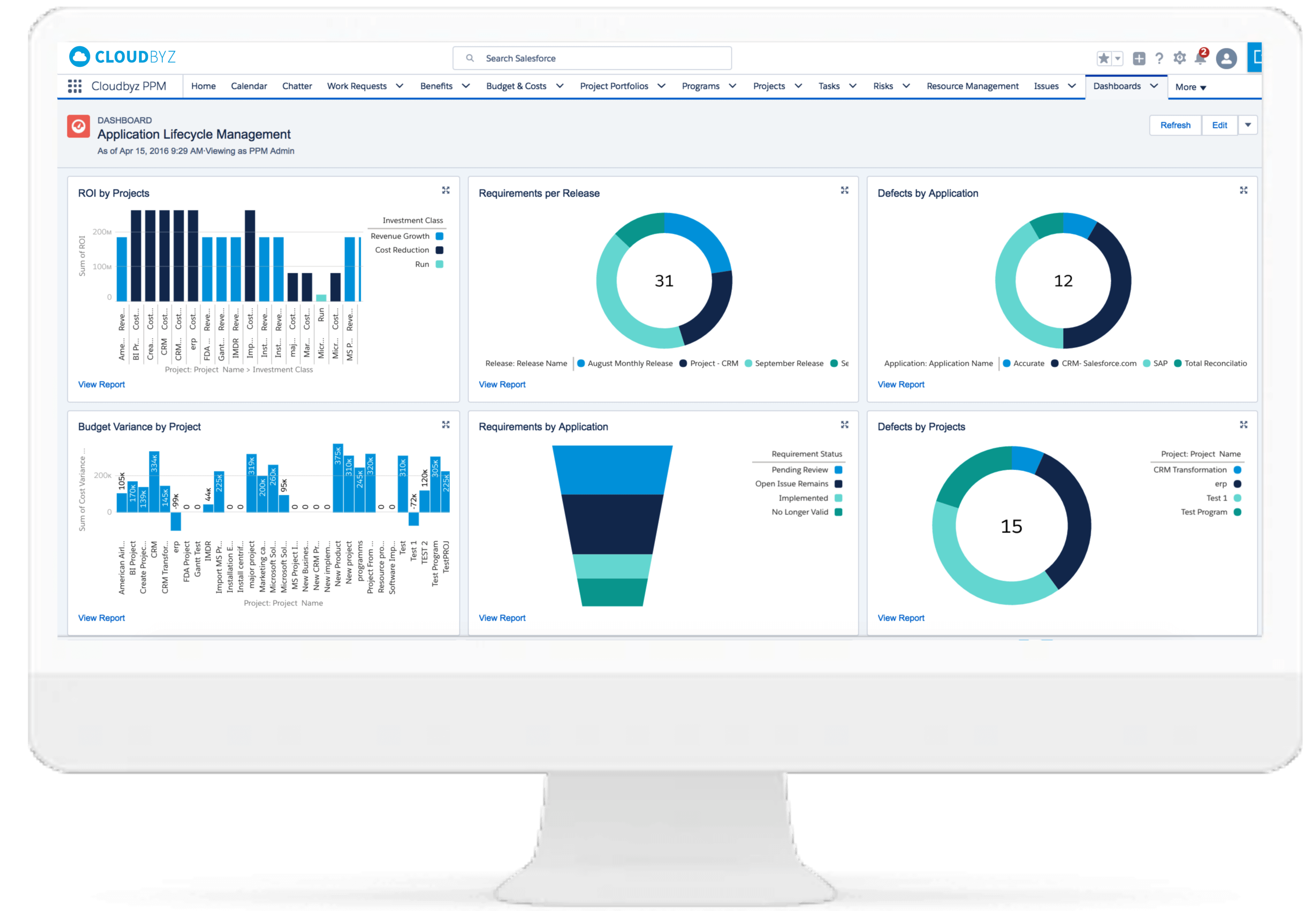 Organizations that don’t have tightly integrated PPM, ALM and APM typically collect data through meetings, e-mails and other manual methods, then copy or paste it into the PPM system. This approach is slow, error-prone and unnecessary. With the Cloudbyz solution, real-time visibility gives stakeholders reliable information about the status of projects in motion and allows executives to confidently allocate resources to future development projects.