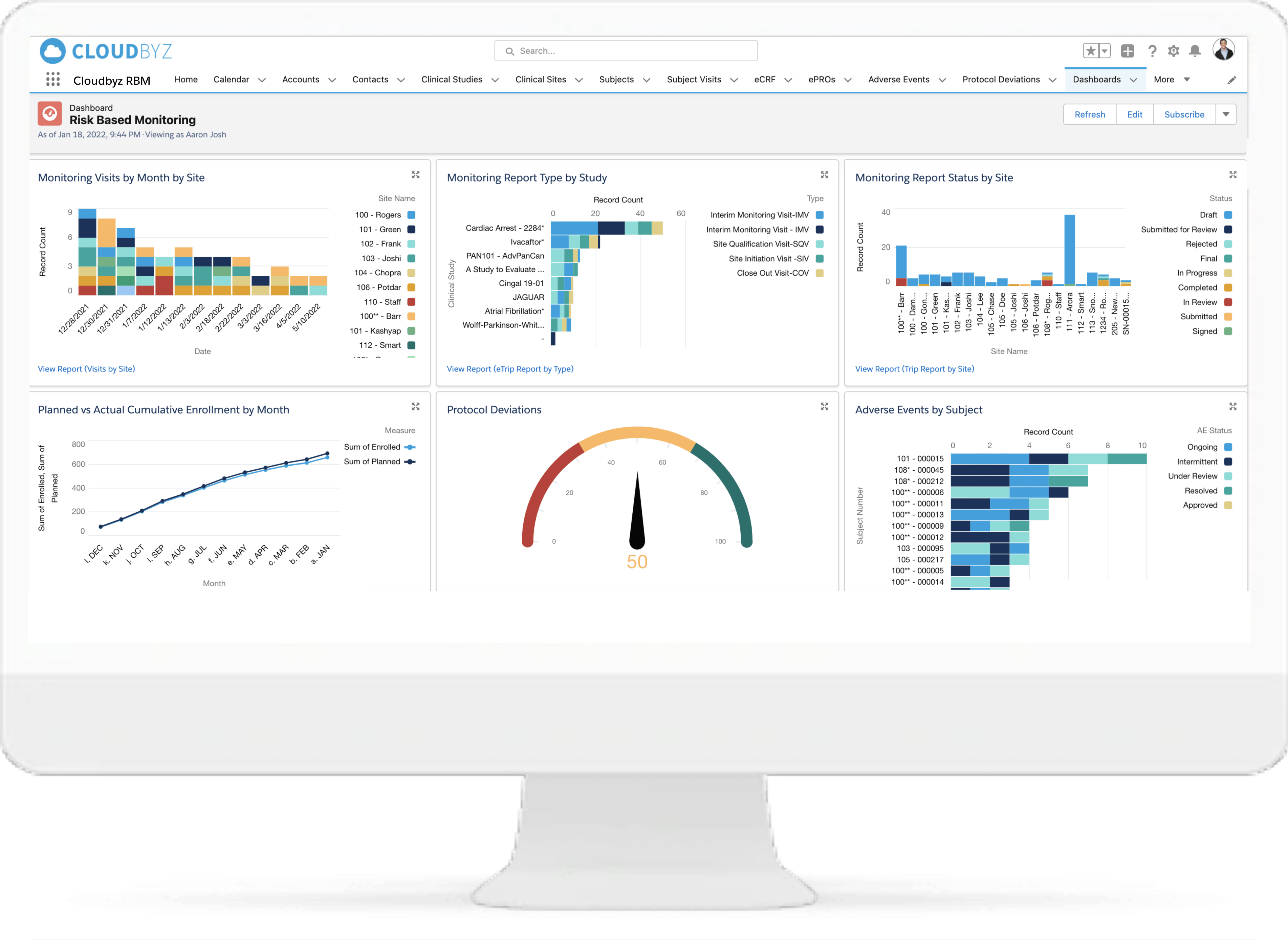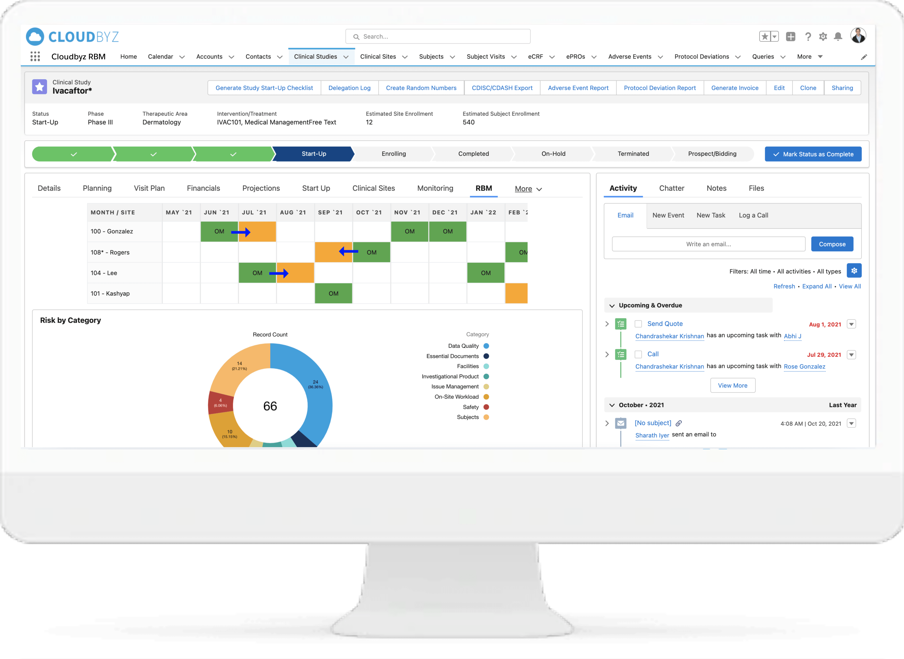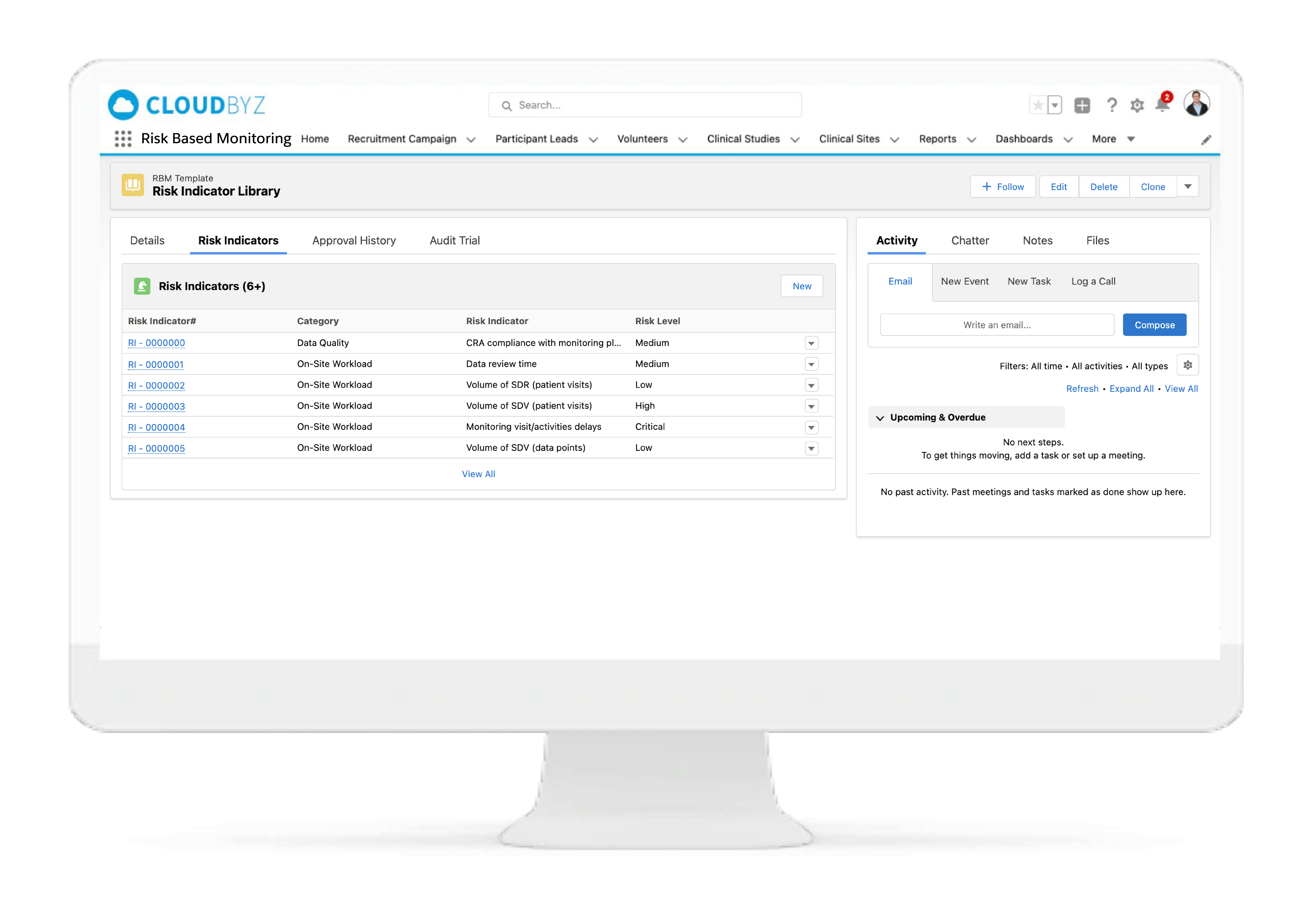 Cloudbyz delivers a Risk Based Monitoring (RBM) Solution that enables sponsors to improve their clinical oversight process, reduce time, costs, effort, and empowers them to review important monitoring activities, in real-time across the sites, all from one place. Our solution has the tools which offer quick results for the sponsors without the need for extensive programming, or even statistical experience.
