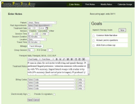 eTherapyDocs makes documenting treatments easy. Our interface allows for a verbose treatment narrative, support voice dictation, and patient goals are easily viewed, updated, and included in your treatment notes. Our interface supports all of the word processing your practice requires including, bold, underline, copy and paste, spell check, and other formatting typically available within a word processing system.