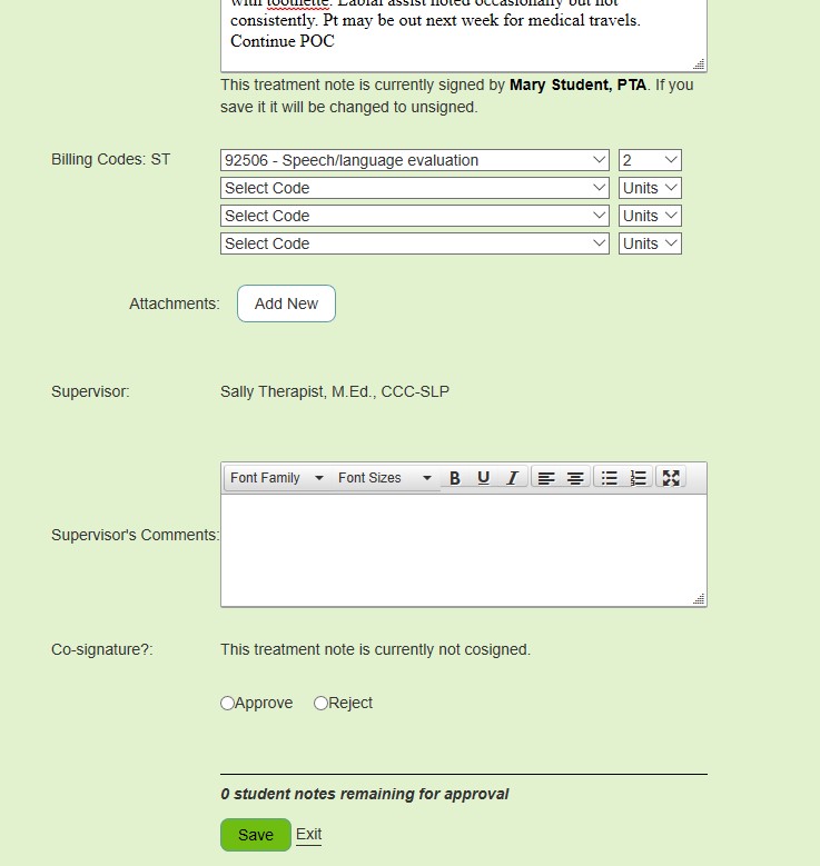 eTherapyDocs has completely automated the process of having assistants and students have their notes co-signed. The assistant or student simply selects their supervisor when creating a treatment note, and the system takes care of negotiating the approval or denial with the supervising therapist. Supervisors can provide comments and once approved their signature is part of the treatment note, Plan of Care, or Progress Note.