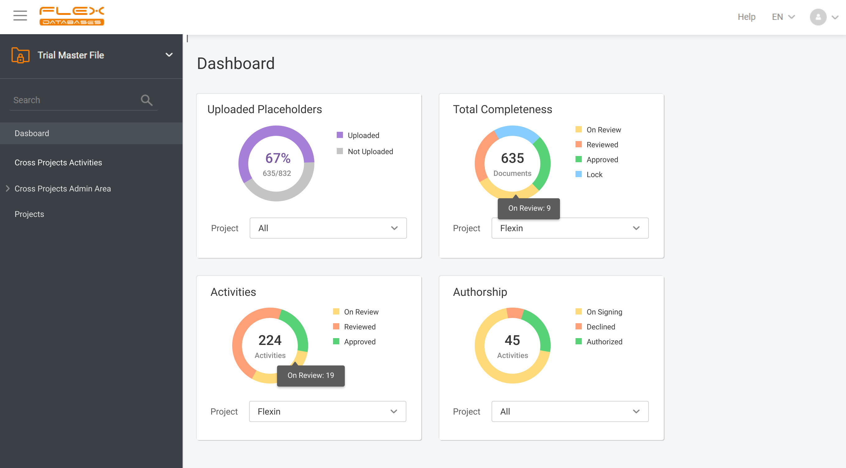 See missing documents, files uploaded statistics, folder completeness by milestone or any other parameter.