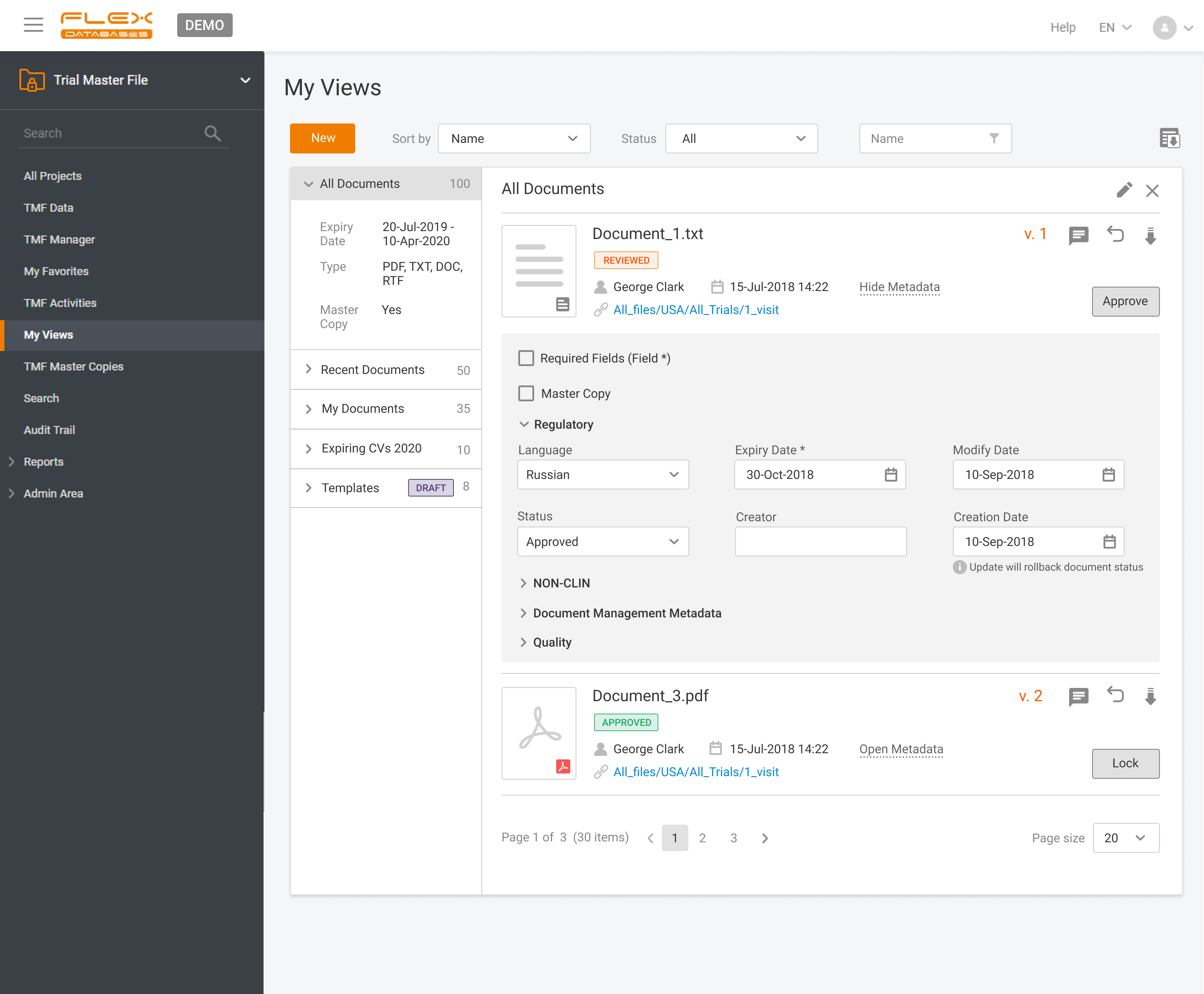 Periodic review of eTMF is finally easy with My views tab to choose a list of documents for review and use inbuilt chat function to query and correct a document