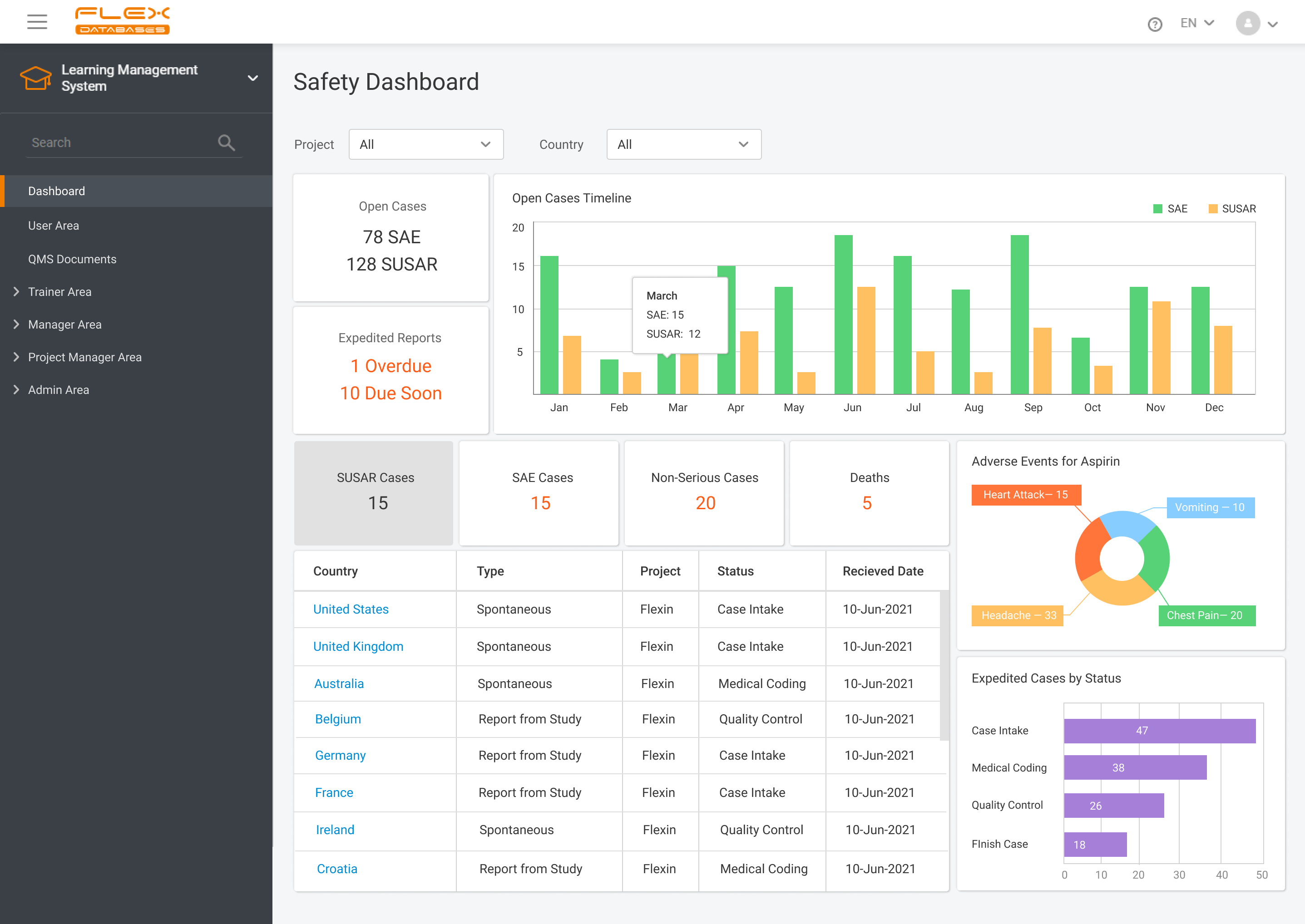 Flex Databases Pharmacovigilance is a comprehensive drug safety database that ensures robust and compliant pharmacovigilance activities both within clinical trials and post-approval stage. End-to-end process of collecting, triage, evaluation and submission of safety data in a single point.