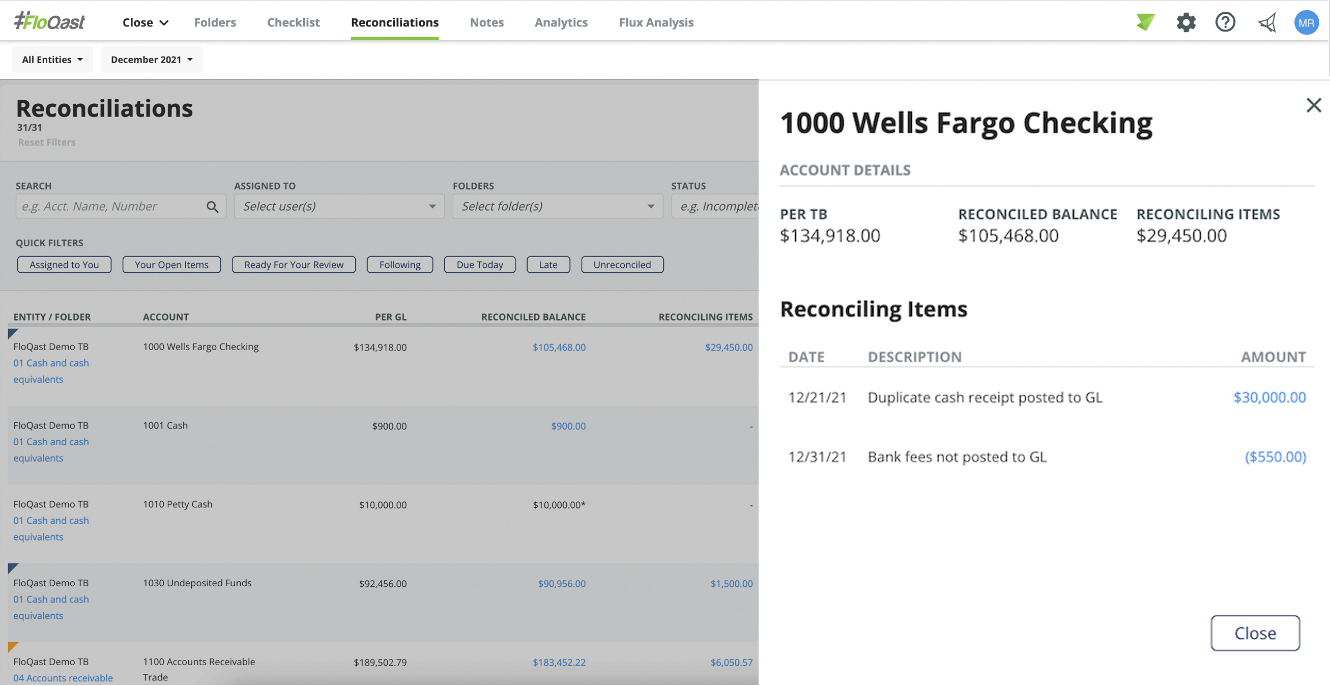 FloQast Reconciliation Management is an advanced workflow automation solution that works with FloQast Close to deliver end-to-end account reconciliation management, driving increased financial velocity and accuracy of the financial close while managing the risk of misstatement.