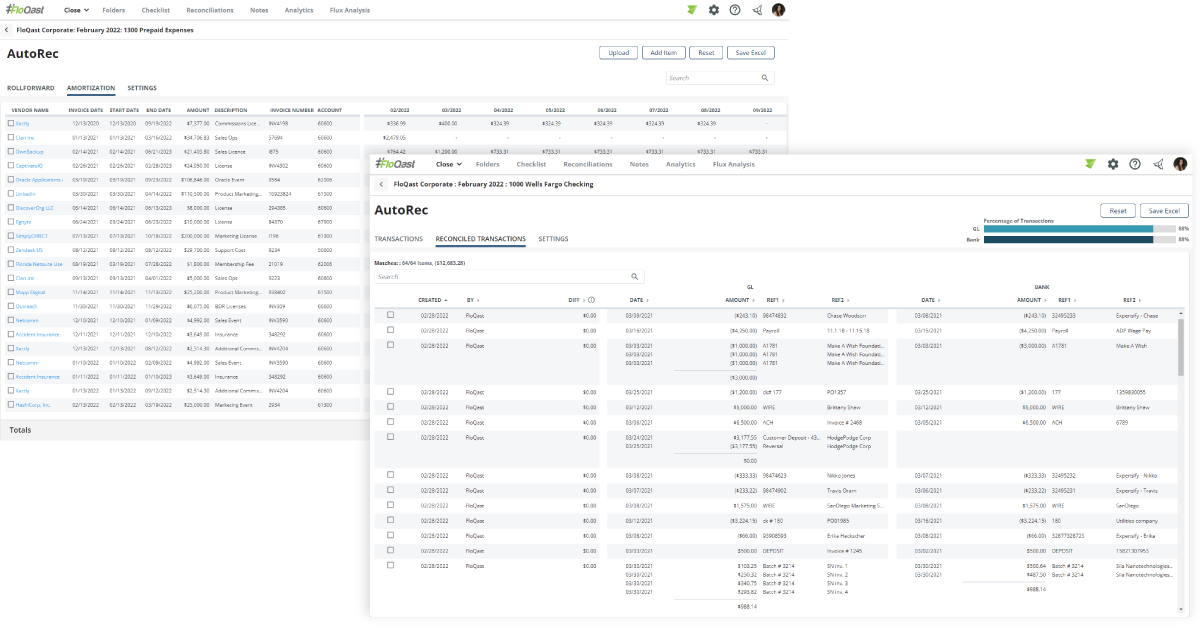 FloQast Reconciliation Management gives teams the flexibility to choose the most effective reconciliation method for each account. AutoRec Matching automates the reconciliation process for bank, clearing, credit card, intercompany, and other accounts, saving your team signifiant time by matching thousands of transactions automatically. AutoRec Amortization sets up automatic amortization schedules for prepaid accounts. FloQast also integrates with spreadsheets for reconciliations that are done better manually.