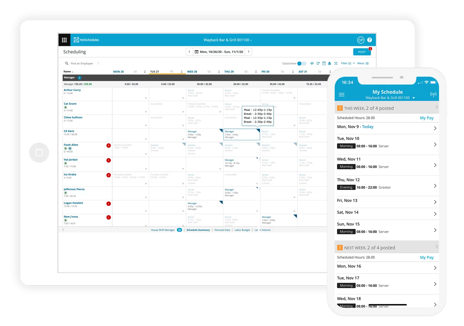 Mobile – Keep managers out of office and engage employees with HotSchedules’ leading mobile features. Employees can view estimated earnings and swap, pick up, or drop shifts, while managers can approve these transactions on-the-go