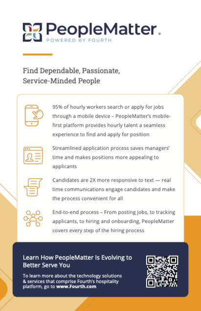 At PeopleMatter powered by Fourth, our mission is making it easy to find dependable, passionate, service-minded people. We have built powerful applicant tracking system tools to help you uncover the best applicants who fit your brand and business needs. PeopleMatter enables you to target the best talent, save your managers time, and make new employee onboarding even faster and easier.