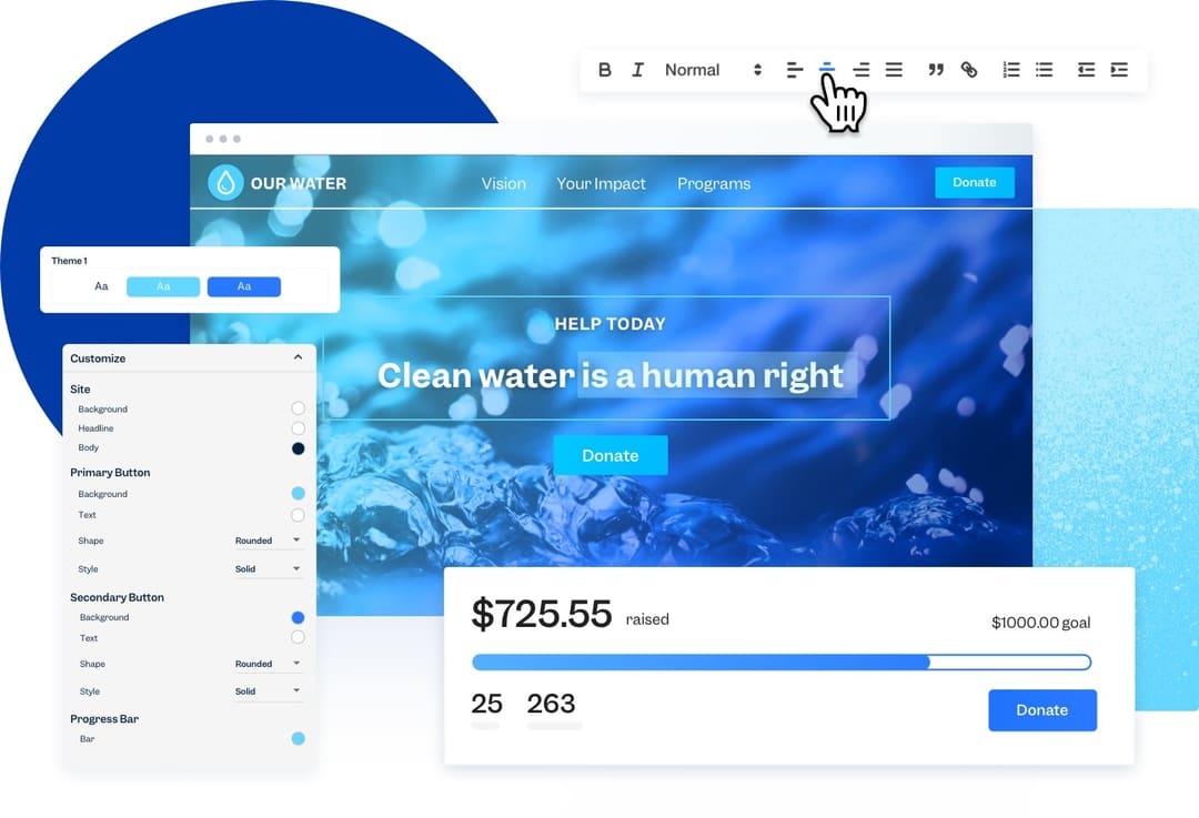 Rally supporters and fund program goals with impressive campaign websites. Add bells and whistles with the easiest site editor around.