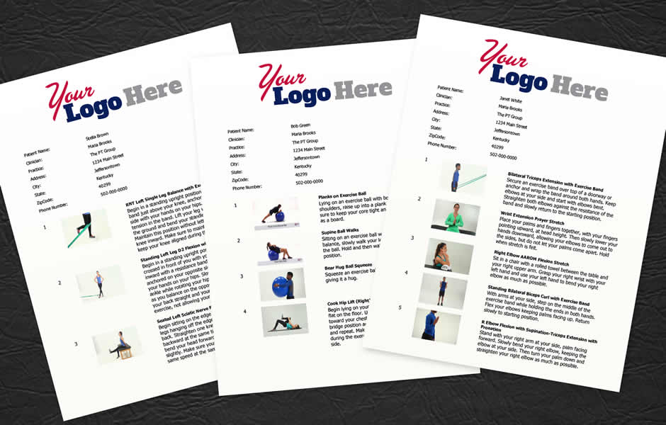 Printed comprehensive instructional exercise handout that your patient can take home with them.