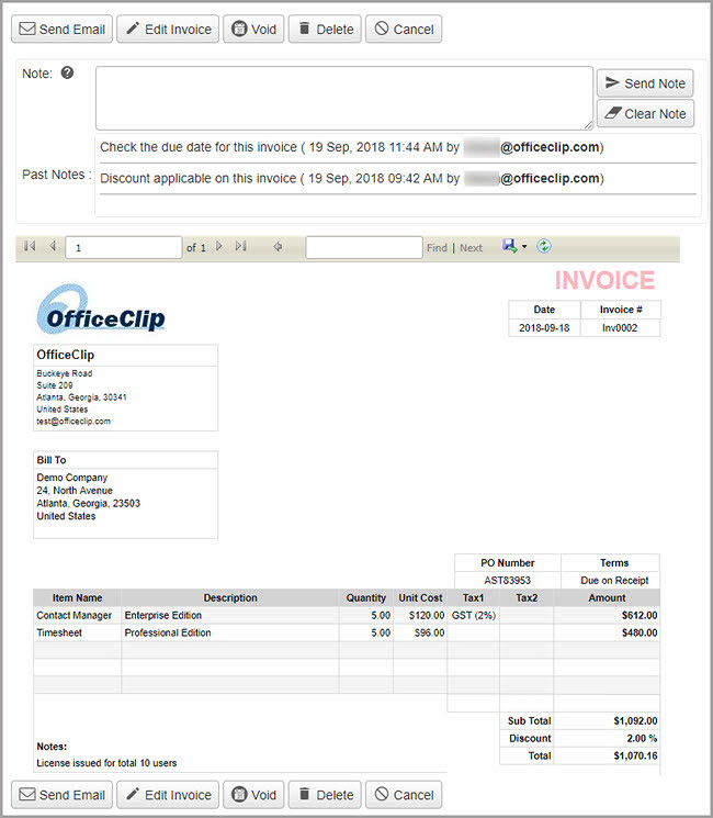 An Invoice is a written agreement between the buyer and seller which specifies the details of the goods or services purchased. It usually consists of the Invoice number, PO number, item name, description, quantity, cost, etc. OfficeClip contact management software helps you to create and send invoices easily to your customer.