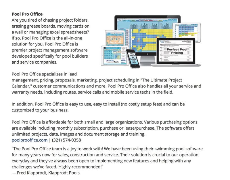 Pool Pro Office can simplify the way you do business. Our software program is user-friendly and offers countless features for you to easily manage files, schedule appointments, communicate with clients and staff, track projects, process invoices, and so much more!