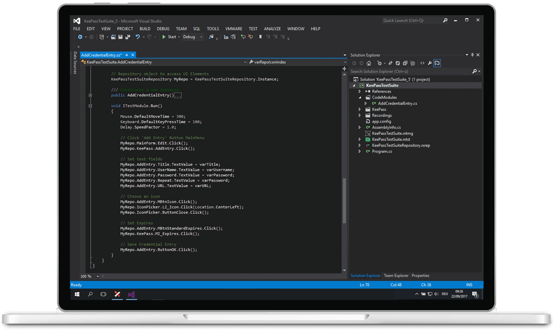 Drag the slider bar to the left to see Ranorex Studio’s integrated development environment for testers who prefer to build automation modules using standard programming languages. Our full IDE for C# and VB.NET includes productivity features such as intelligent code completion, tools for debugging and refactoring, automation helpers, and more. Boost team productivity by creating and sharing automation modules as user code collections and methods. Collaborate effectively with support for source control and the Ranorex Magic Merger tool.