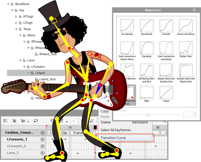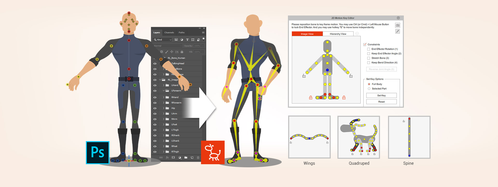 Cartoon Animator 4 enables artists, illustrators, cartoonists and designers to easily create animatable 2D characters from static images, photos, paintings, and even layered Photoshop PSD. The 2D Bone Editor has all the tools to successfully structure sophisticated bone rigs. Users can use pins to constrain areas to selected bones and optimize subdivision topology for smoother bending effects. Save effort on custom bone-rigging and key frame animation by providing full facial and body rigged character templates allowing users to utilize shared bones structures while enjoying a huge library of cartoon motions.