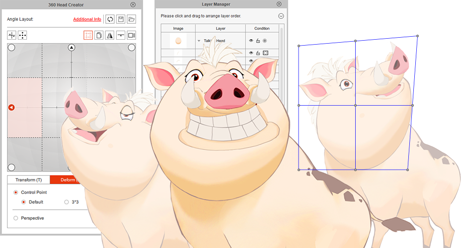 3D Head Creator of Cartoon Animator 4 transforms 2D art into 3D styled characters with up to 360 degree of motion for deeply rich performances. Photoshop round trip integration for editing multi-angle character in and out of 3D Head Creator.