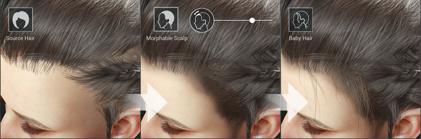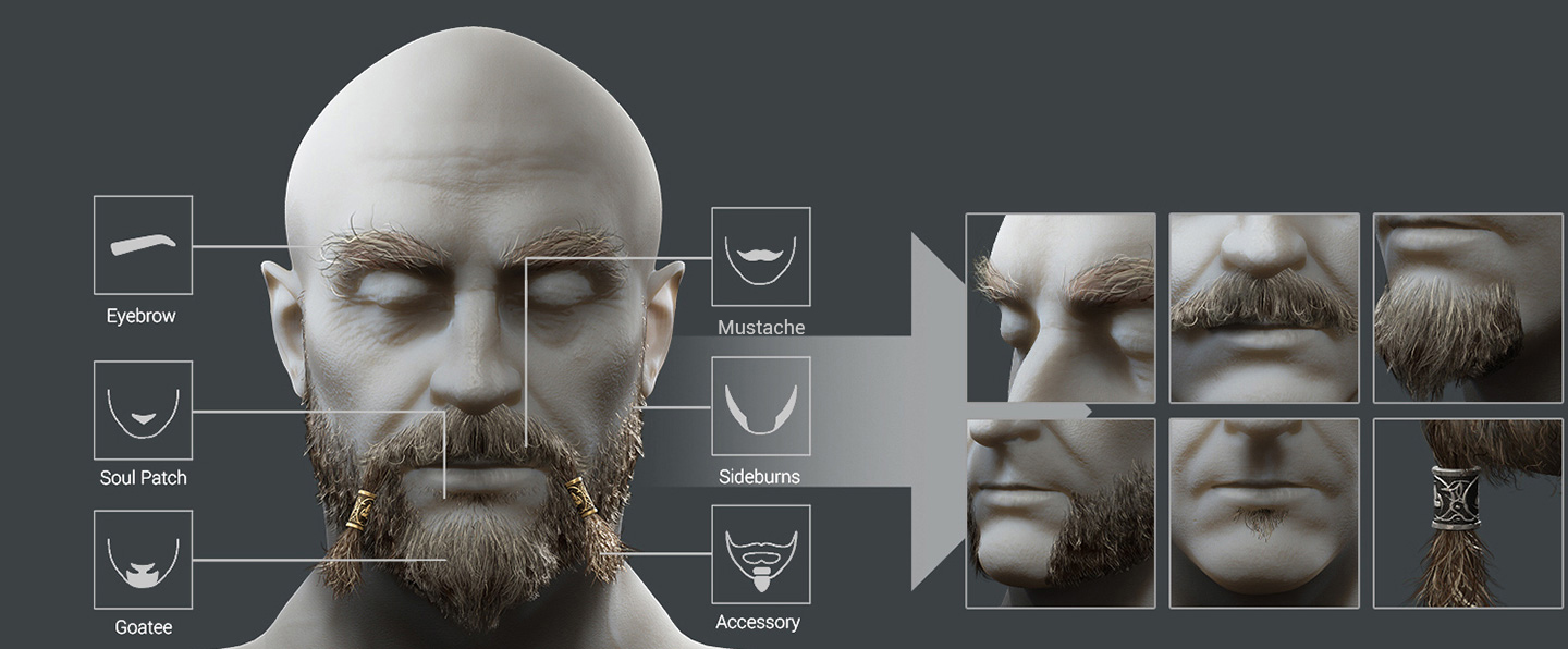 The embedded Smart Hair system is designed to provide the most realistic yet performance-friendly Hair, Brows, and Beard for digital humans in games and films. The card based hair meshes are small in size, economical in texture resolution, and efficient for real-time rendering. The highly flexible ombré color gradients and specular variation are empowered by the Smart Hair Shader. The Component Design allows you to freely assemble different hair, and beard elements into unique hairstyles. The beard and brows can dynamically conform to any facial movements.