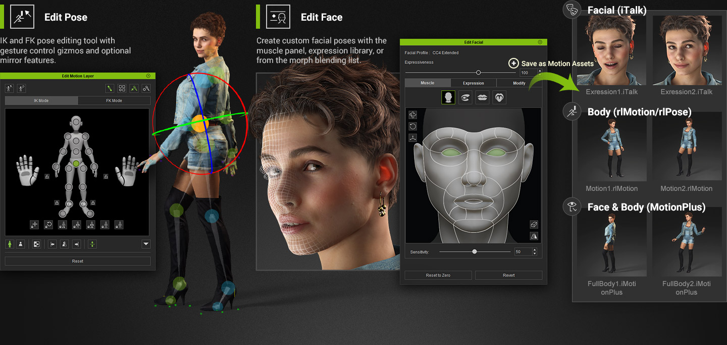 The CC animation features let character designers see living characters inside Character Creator, helping to check imported character rigs, enhancing cloth skin weight and physics, and testing facial expression and lipsync assignment right after customization.