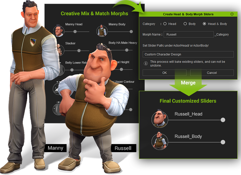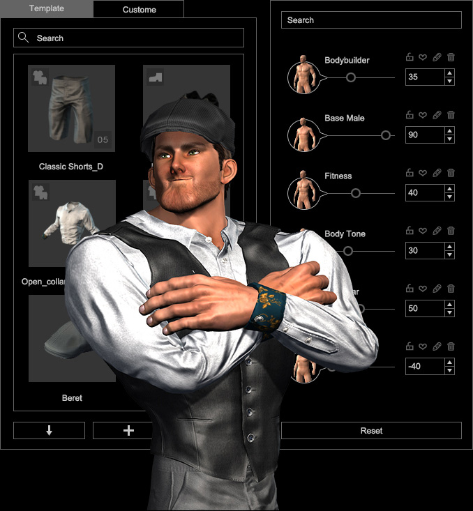The core capability to make unlimited fully-rigged characters lies in the heart of modeling morph designs. Further enhance realistic 3D humans, fantasy or cartoon designs, users can freely blend betweens them for new character looks. Experienced 3D artists can sculpt elaborate character shapes for unique character IP.