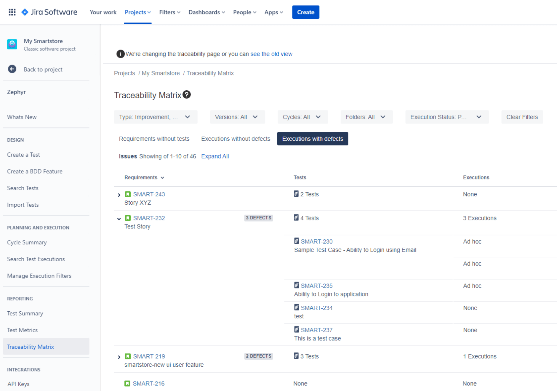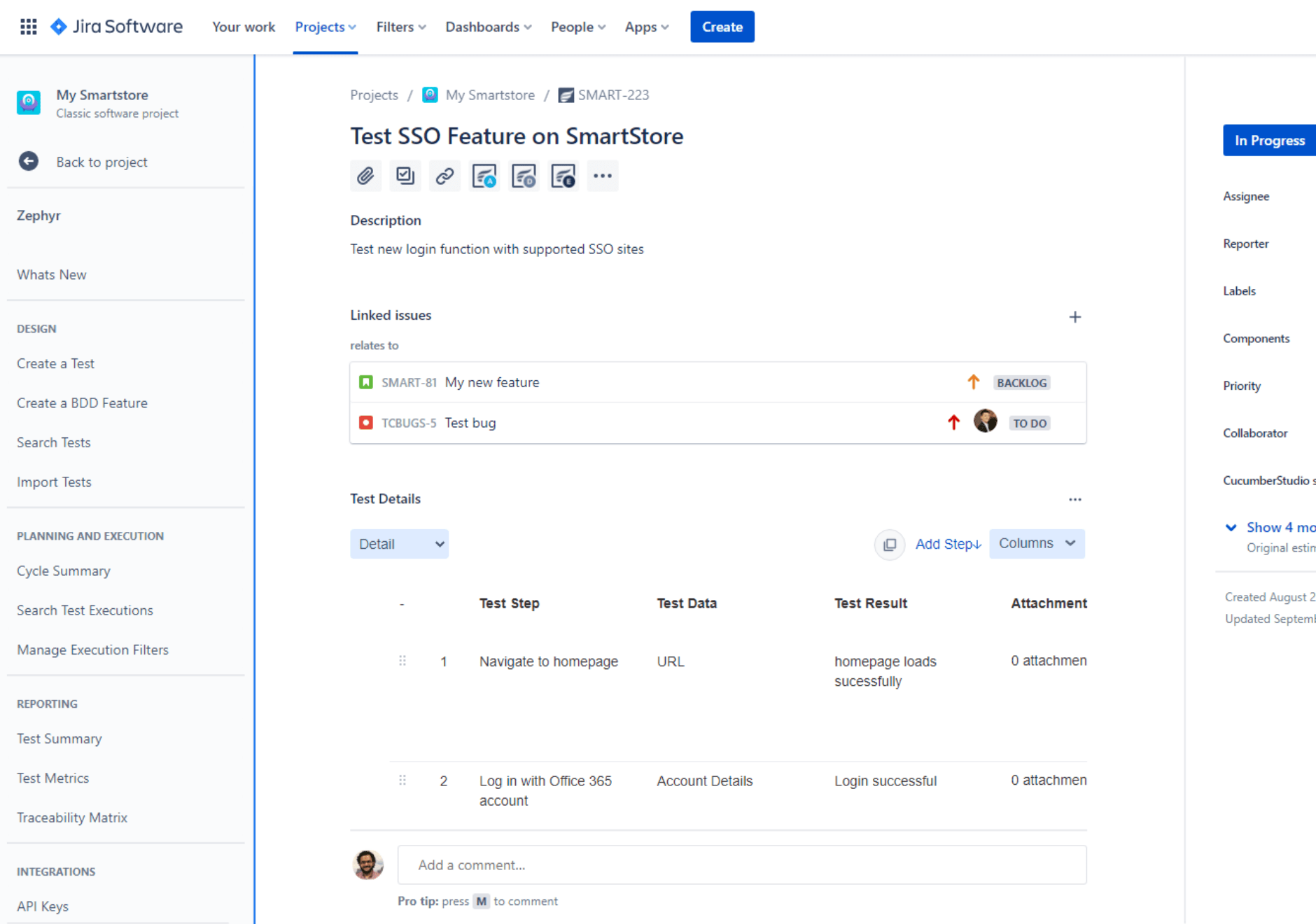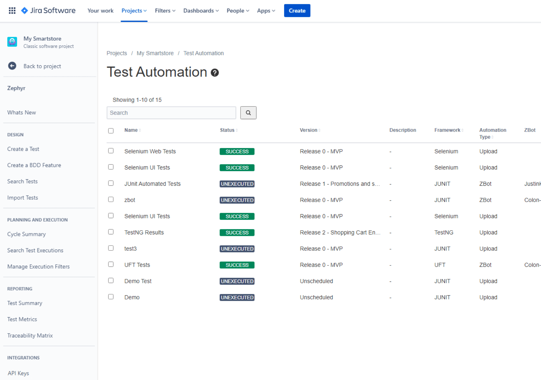 Zephyr is a test management solution. It allows improving the quality of your products by creating and managing test cases and monitoring your testing process. Zephyr Squad (formerly known as Zephyr for Jira) enables you to manage your testing efforts directly from Jira: you can create Test items in your Jira project, link them to other Jira items, group tests in cycles, assign them to release versions, and monitor the testing process.