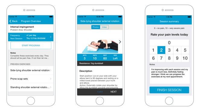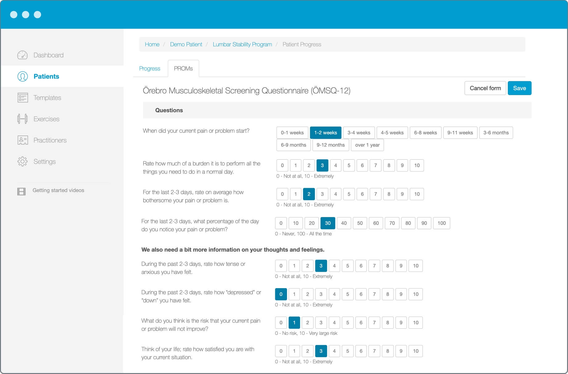 Patients are able to log program completion, session difficulty and symptoms through their mobile phone. With the dashboard you can stay informed and get a snapshot of your patient’s progress in between or before consultations. Your patients will feel connected and supported.