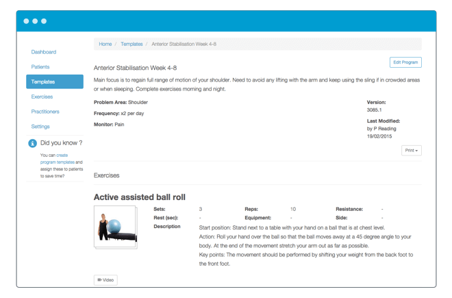 Save time by creating template exercise programs for common injuries and conditions. Share these templates with your team. Assign, edit and send them to your patients in less than one minute.