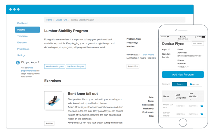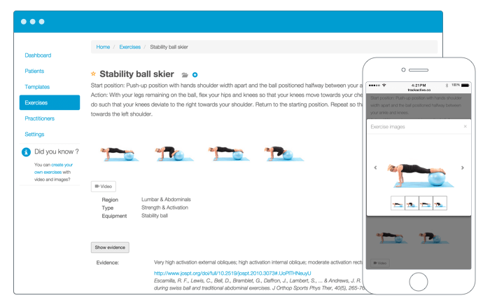 Create and send customised exercise programs to your patients via PDF, a secure mobile web login or to the TrackActive Pro iPhone or Android patient app. With clear instructional images, video and descriptions your patients will know exactly how to complete their exercises.