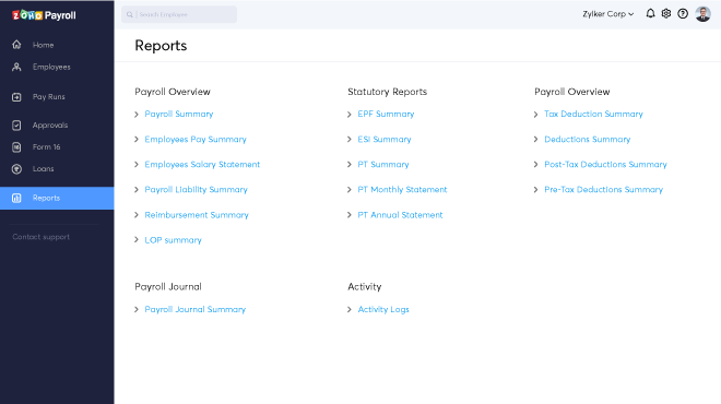Maintain your clean statutory compliance record and generate reports for the tax authorities whenever called for. Zoho Payroll generates a summary of your EPF, ESI, and Professional Tax instantly.